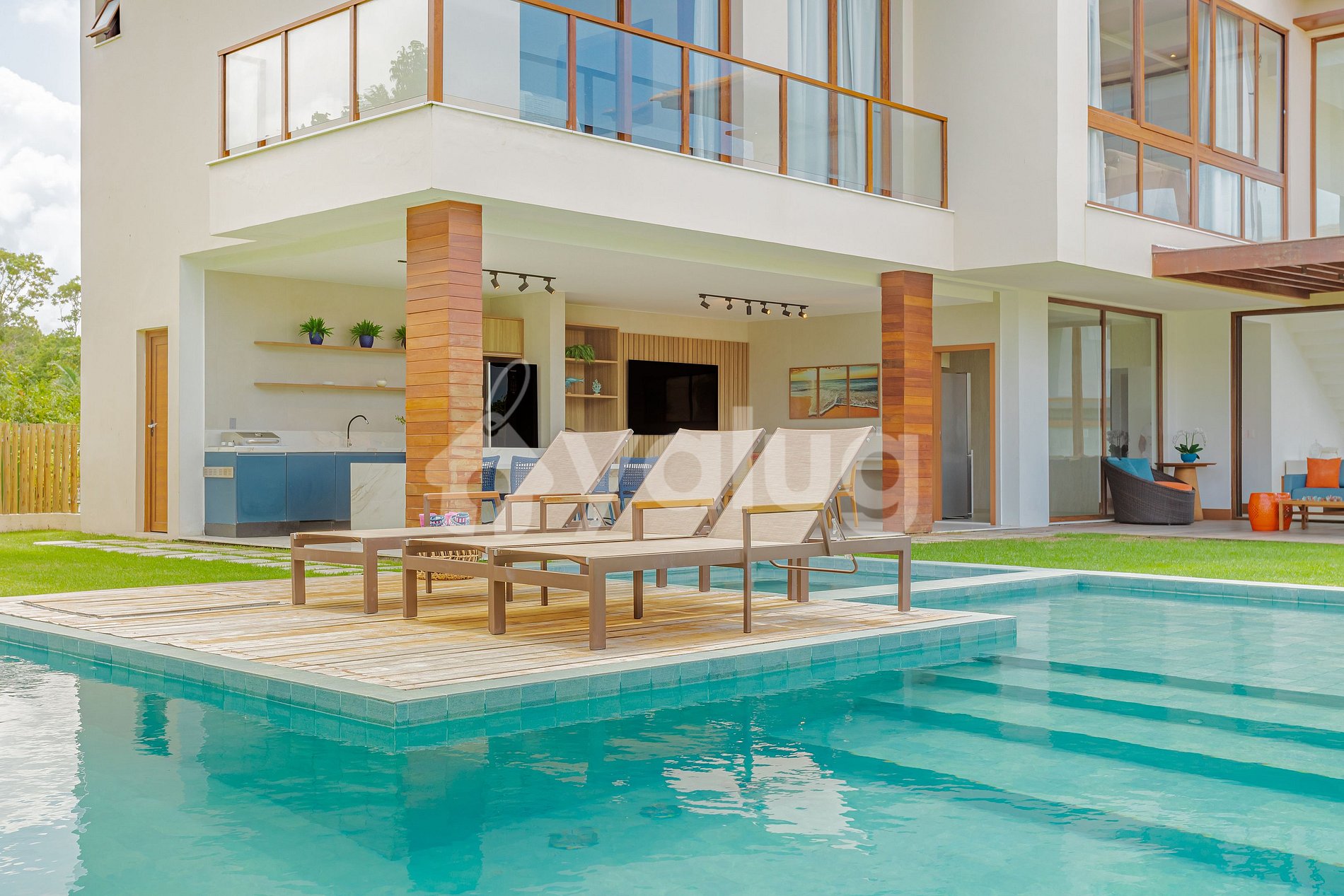 Excelente área gourmet com jardim, churrasqueira, piscina, móveis externos e muito mais!