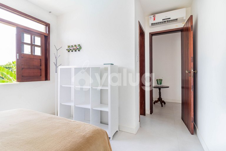 Suíte 2 (superior): 1 cama queen, ar condicionado split, ventilador, armário e cortina blackout;