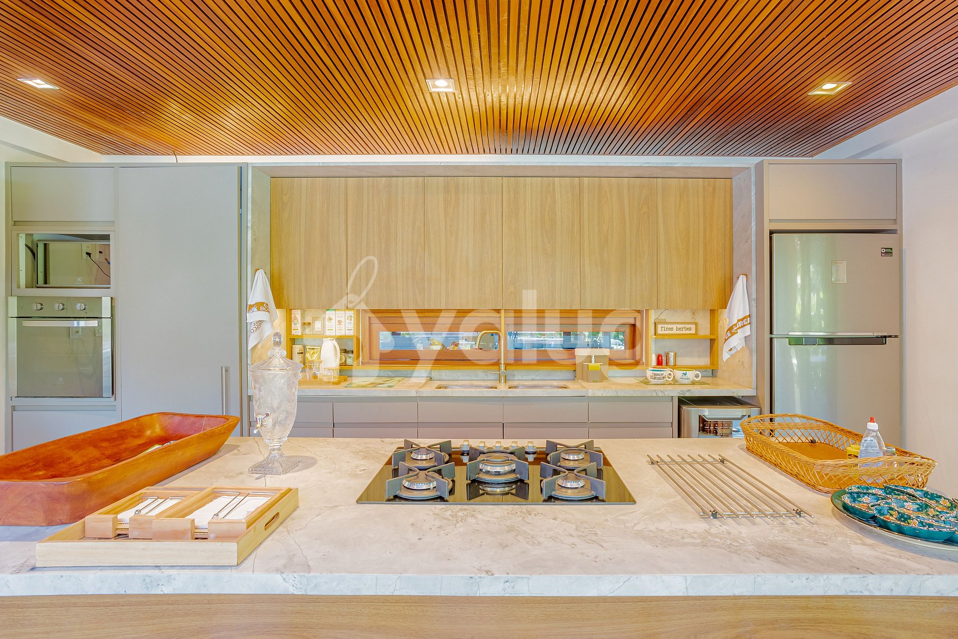 A acomodação inclui sala de estar e jantar climatizadas com vista para a área gourmet, 4 suítes elegantes e cozinha completa.