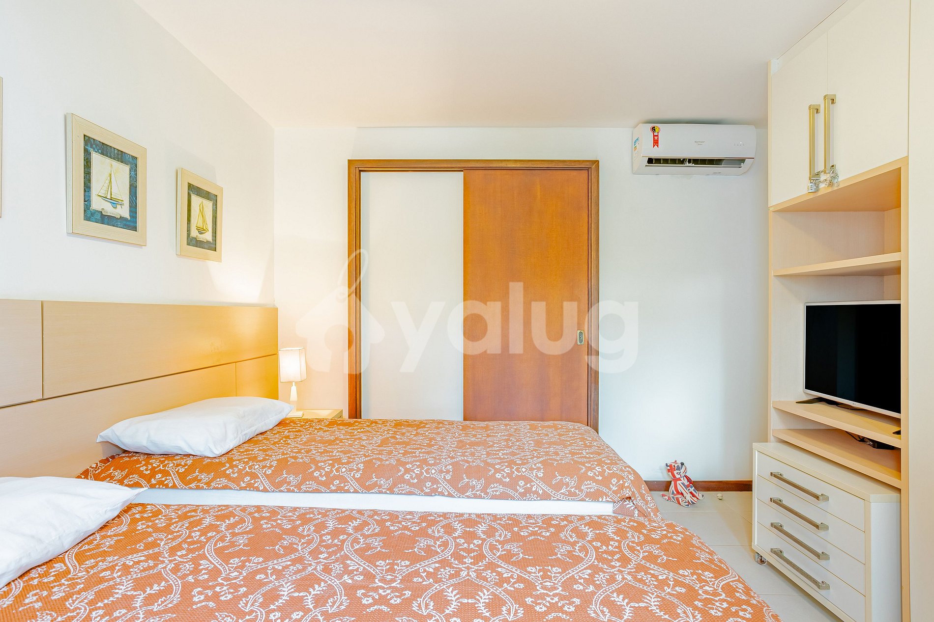 Suite 1 (Terréo): 2 camas de solteiro, TV Smart, ar-condicionado, cortina, black out e armário.