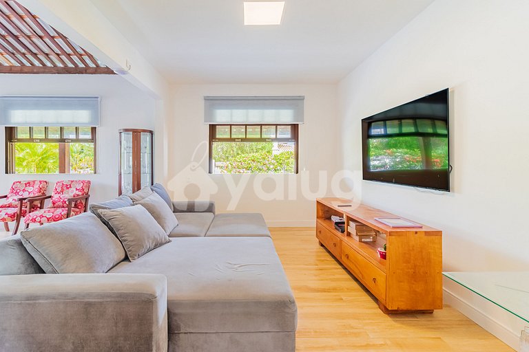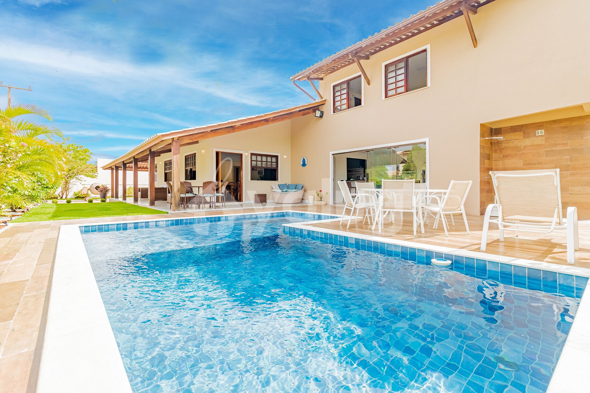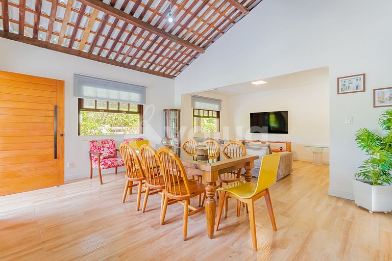 Pensando no maior conforto para os hóspedes, a casa dispõe de 5 quartos (1 suíte), todos climatizados, sala de estar, cozinha completa, Wi-fi, possui uma maravilhosa área externa, com piscina privativa e espaço gourmet com churrasqueira.