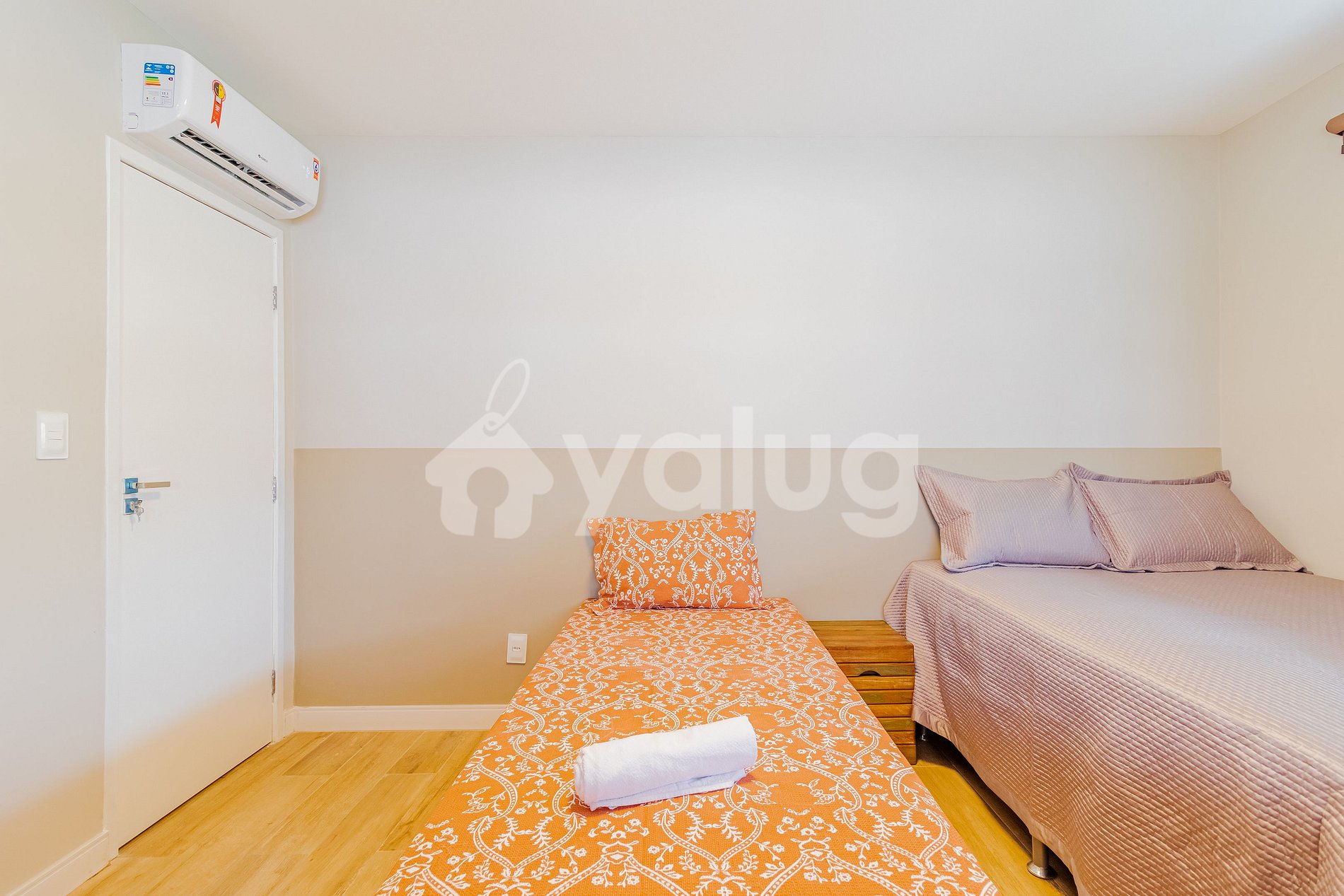 Quarto 2 (Térreo - Área externa):1 cama casal, 1 cama solteiro, ar condicionado split e cortinas black-out;