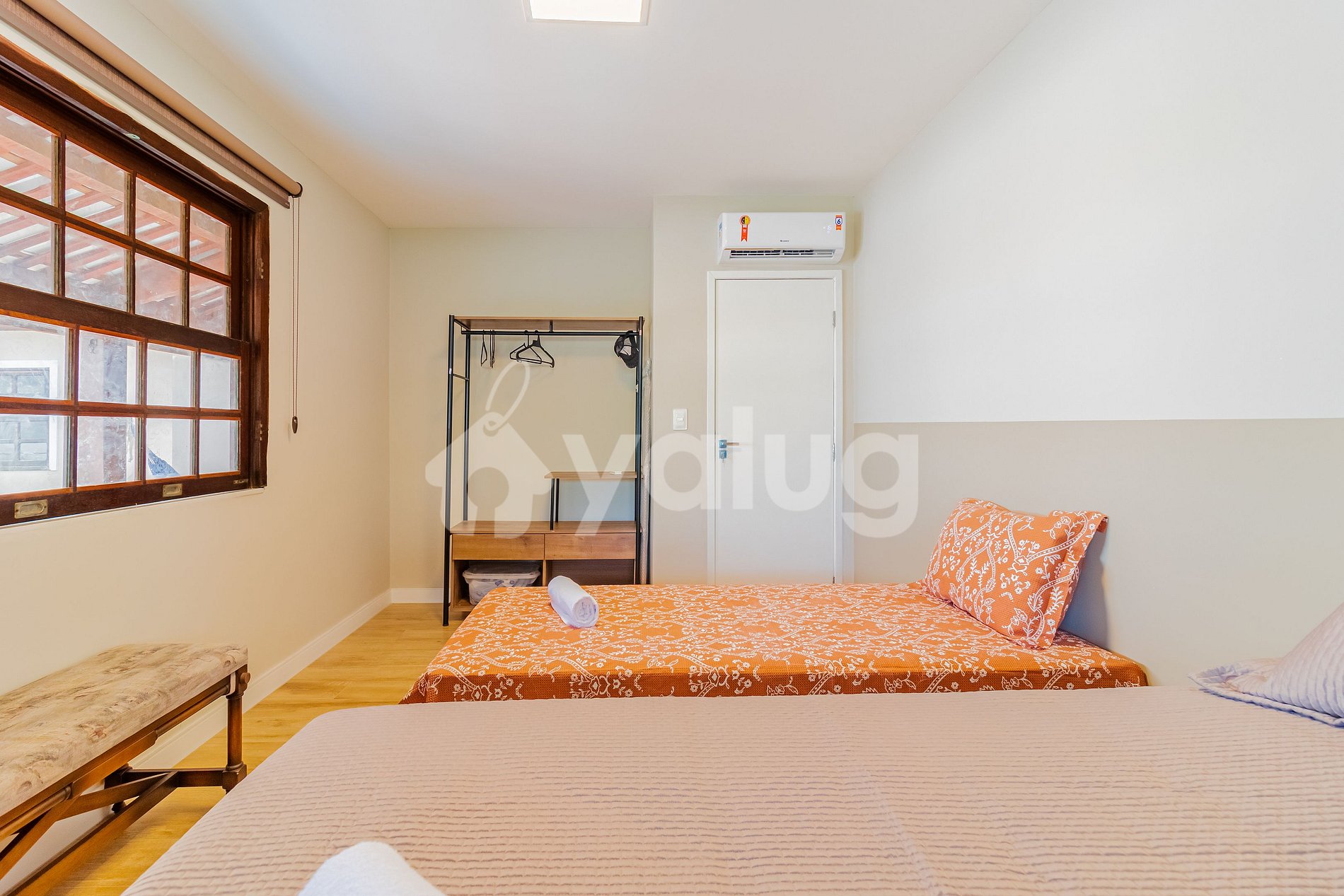Quarto 3 (Térreo - Área externa):1 cama casal, 1 cama solteiro, ar condicionado split e cortinas black-out;