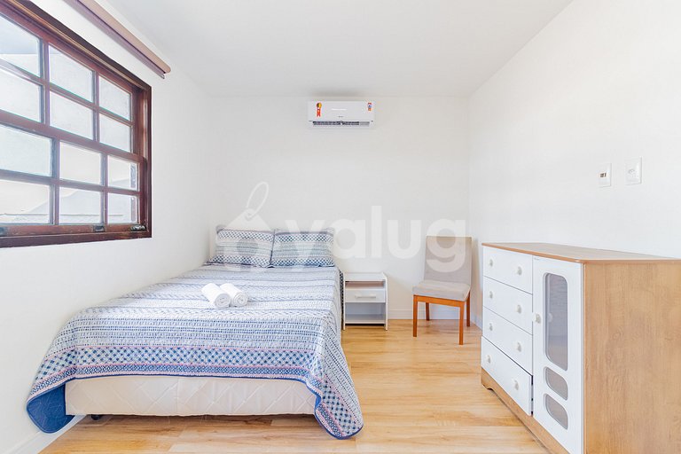 Suíte 1 (Térreo): 1 cama queen, ar condicionado split, SmartTV, armário e cortinas black-out;