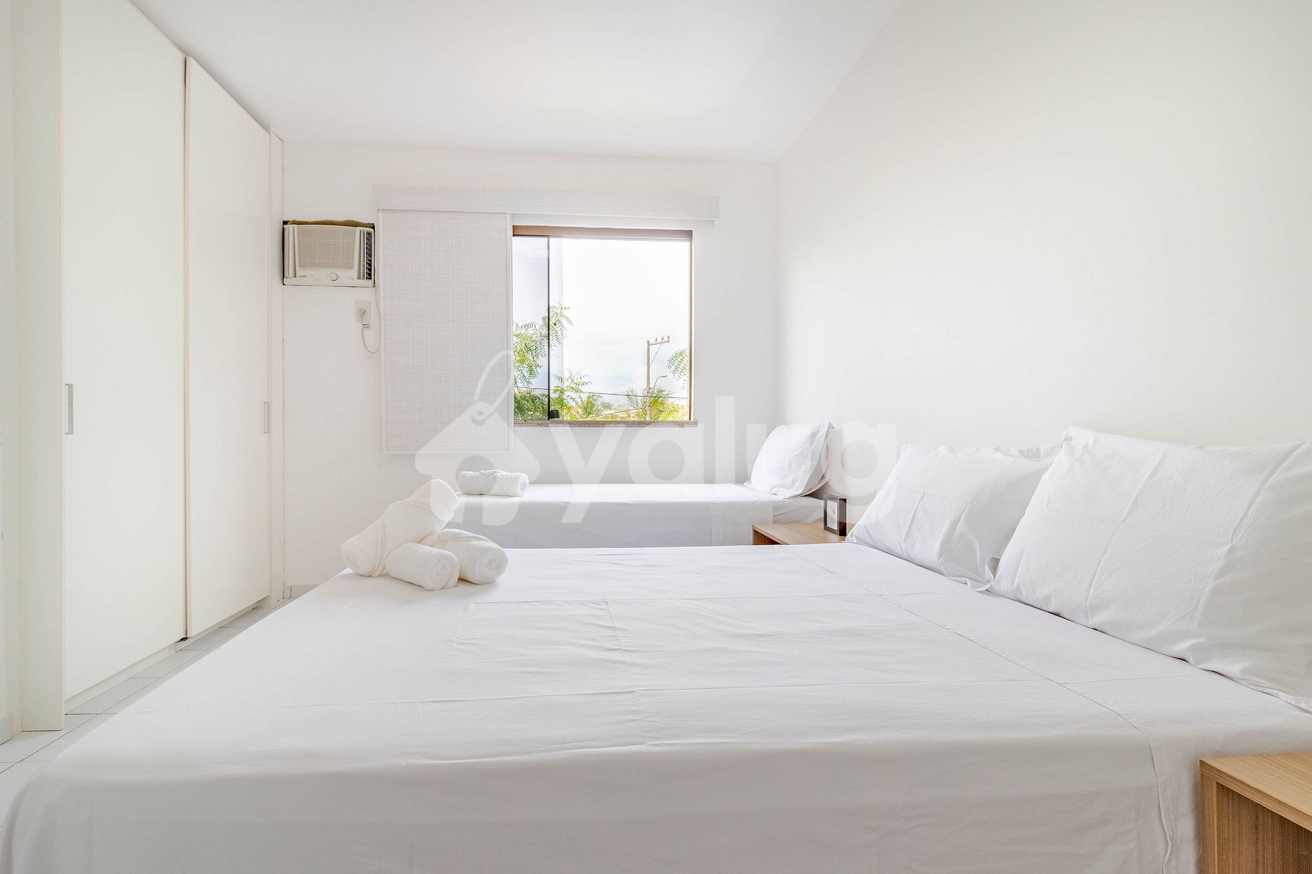 Quarto 2: 2 camas casal, ar condicionado tipo janela, cortina blackout e armário.