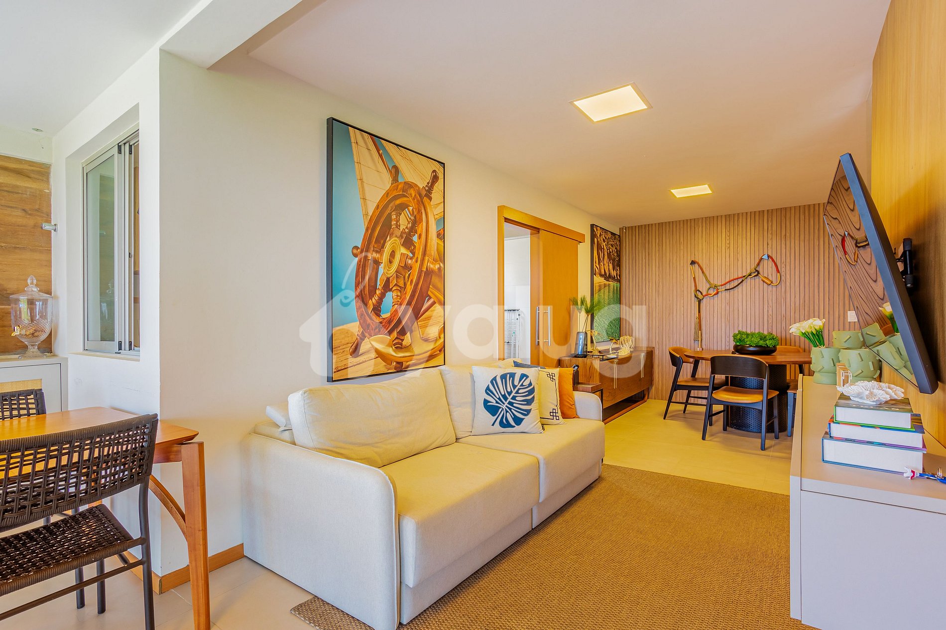 O apartamento é lindamente mobiliado e decorado; Possui 3 belas suítes climatizadas, cozinha completa com todos os utensílios necessários para a sua estadia, sala de jantar arejada e varanda com uma sensacional vista para o mar.