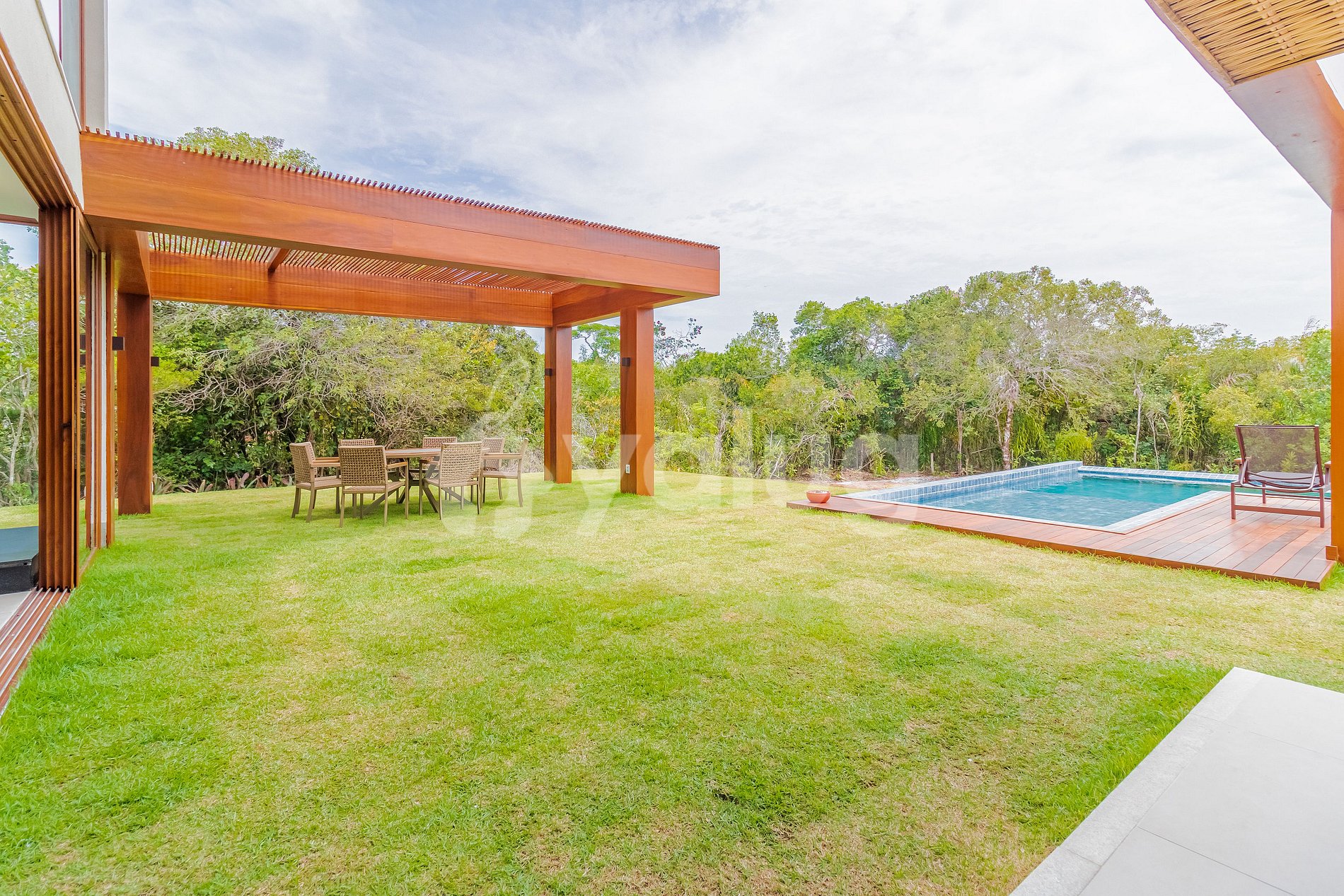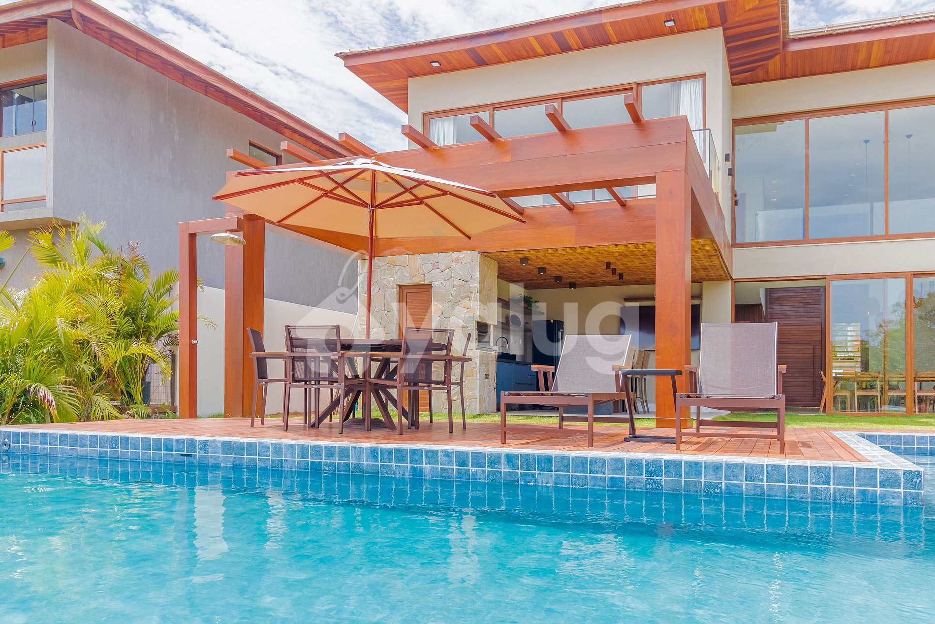 Acomoda até 14 pessoas e conta com 5 suítes (2 no andar térreo), cozinha completa integrada com a sala de estar aconchegante e com o exterior da casa, que inclusive é a melhor parte da casa, com piscina, jardim e área gourmet com churrasqueira.