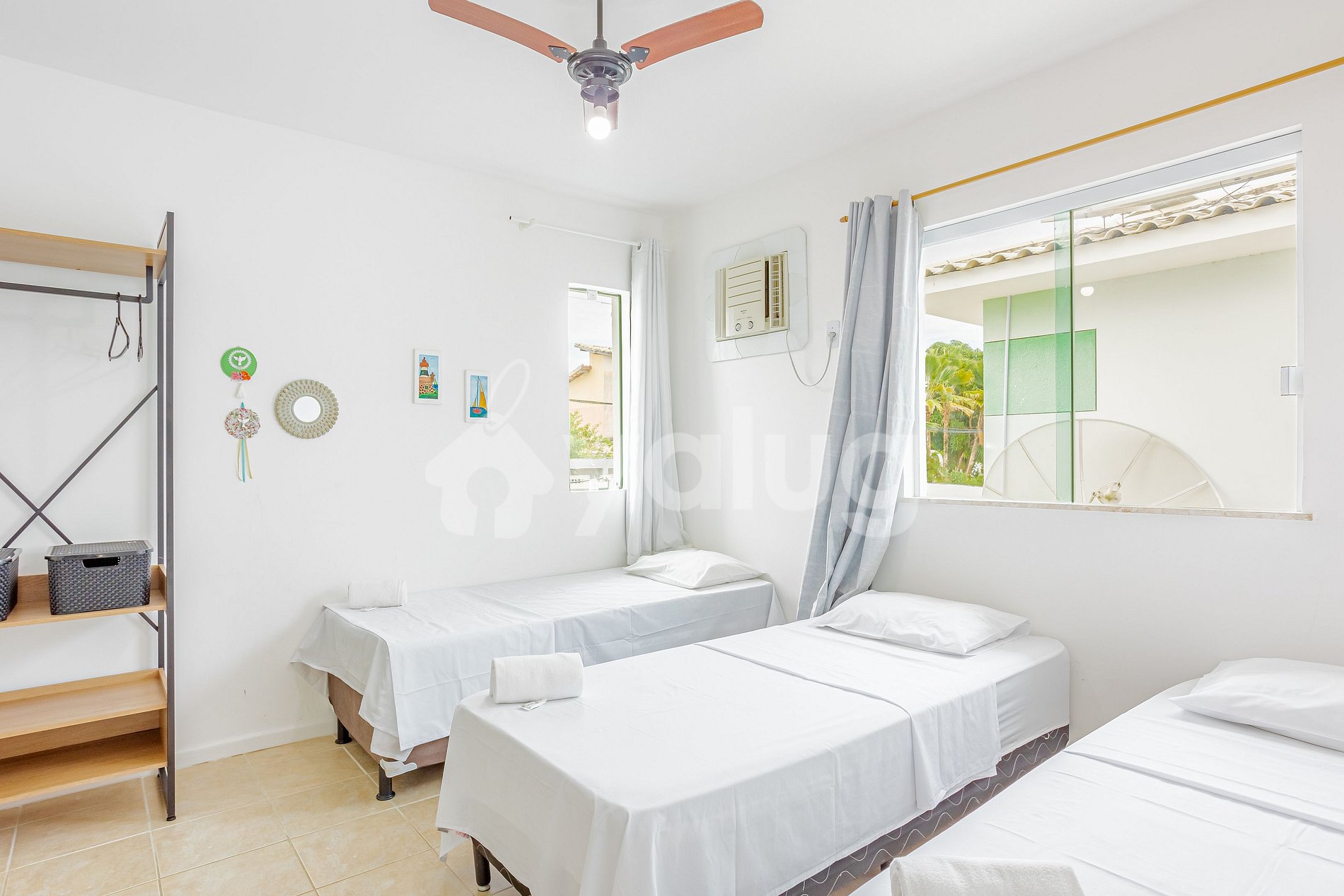 - Suíte 3 (superior): 1 cama casal, 1 cama solteiro, ar condicionado tipo split, armário, ventilador e cortina blackout.