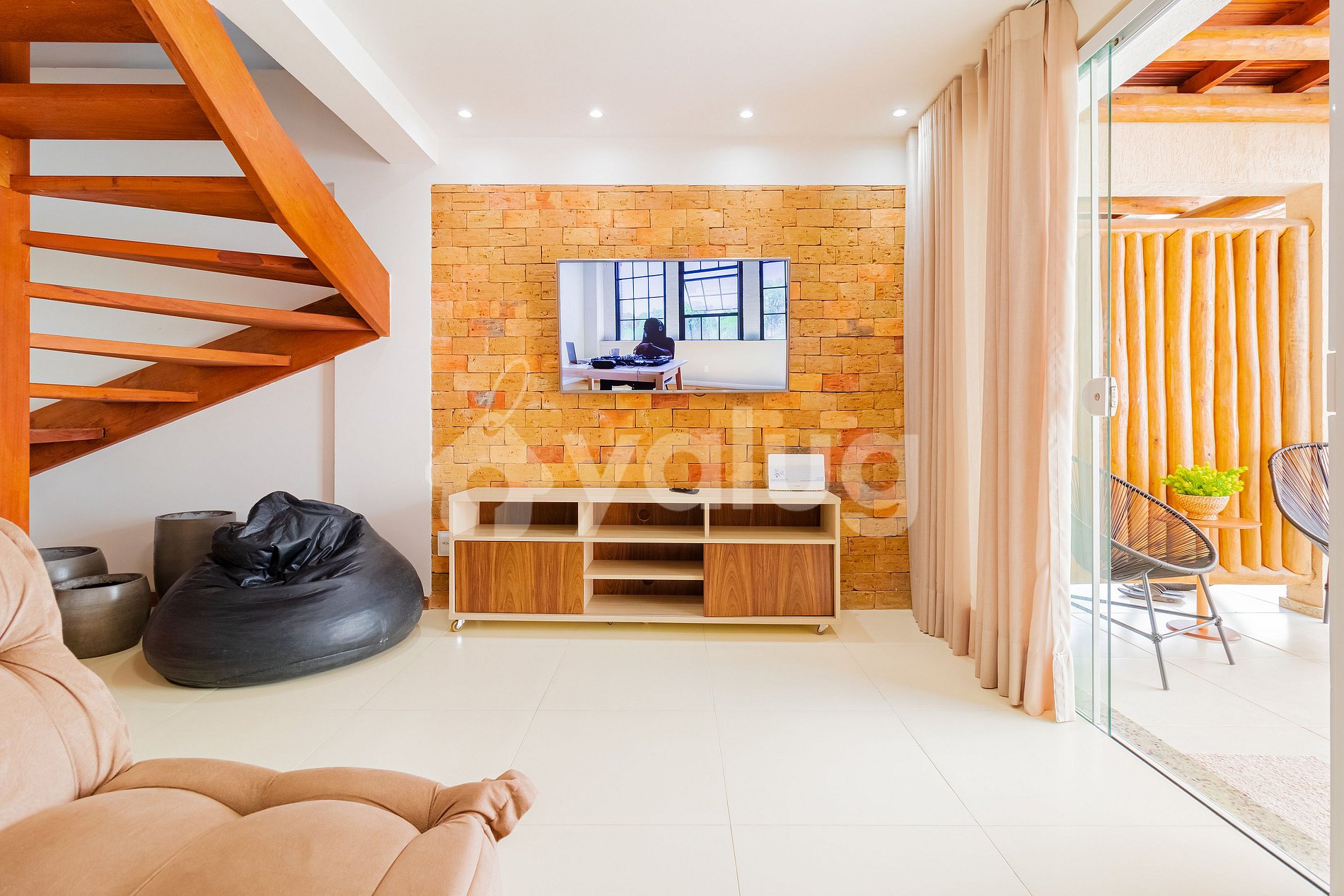 Suíte 1 (Superior): 1 cama casal, ar condicionado split, ventilador, Tv, cortina blackout, armário e varanda com rede de descanso;