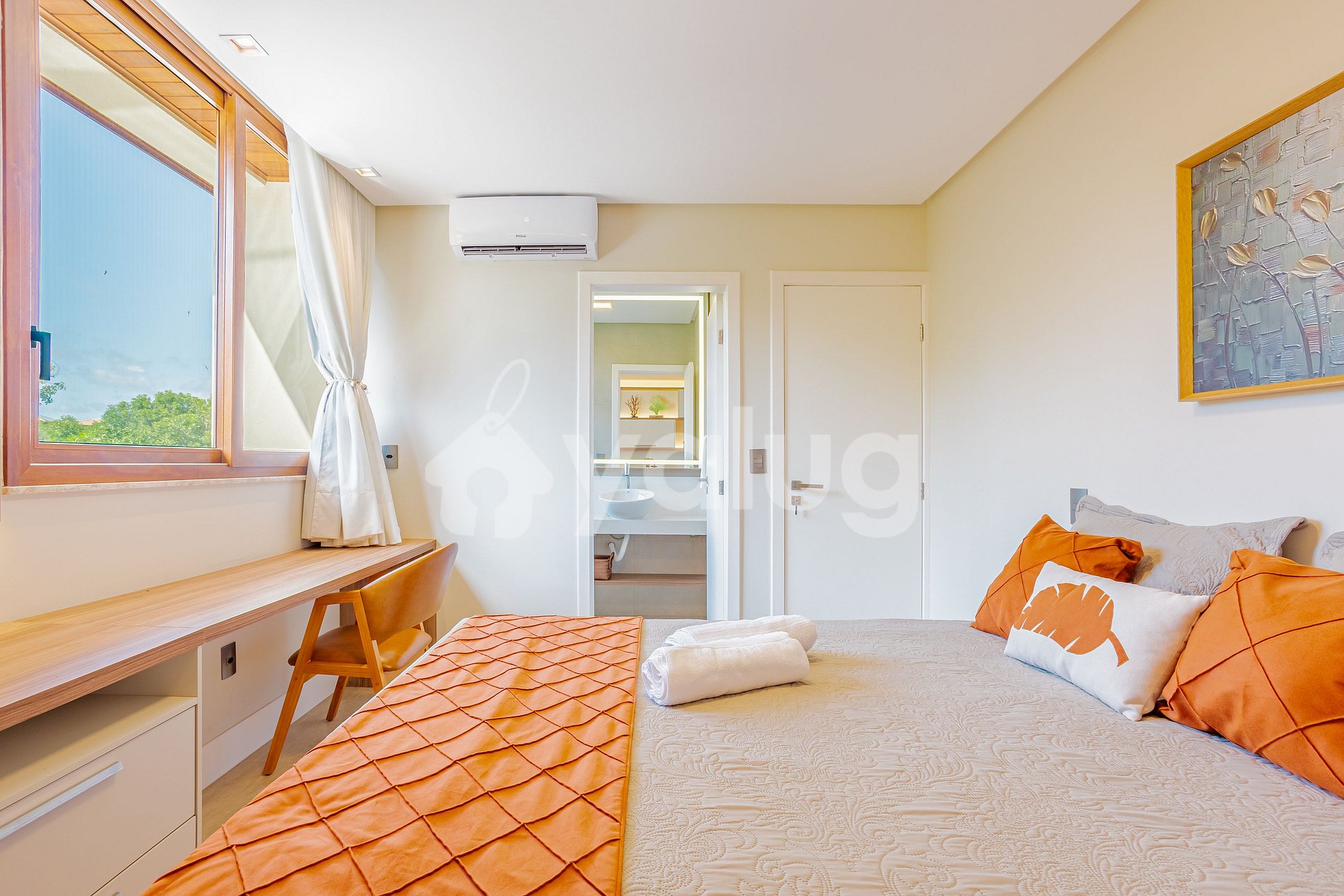 Suíte 2 (Terréo): 1 cama queen, ar-condicionado, cortina, black out e armário.
