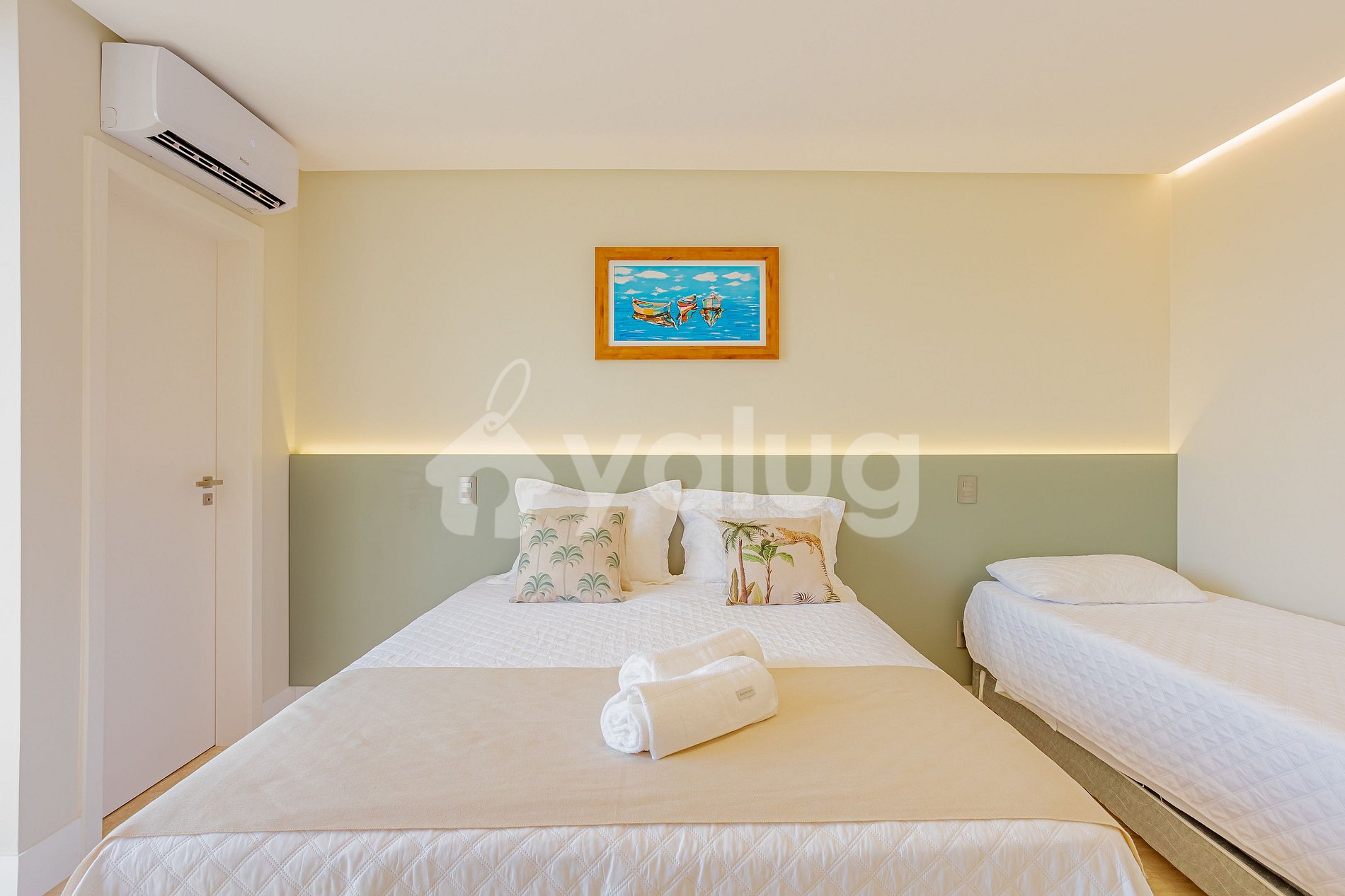 Suíte 4 (Superior): 1 cama queen, 1 cama solteiro, ar-condicionado, cortina, black out e armário.