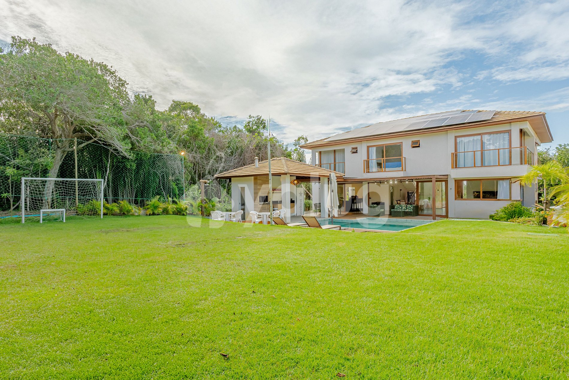 Acomodação composta por 5 suítes, mobiliadas e climatizadas. Além disso conta com sala de estar e jantar, cozinha completa e carregador para veículo elétrico. Área gourmet com churrasqueira, uma belíssima piscina, campo de vôlei, sauna, e muito mais para você usufruir durante sua estadia.