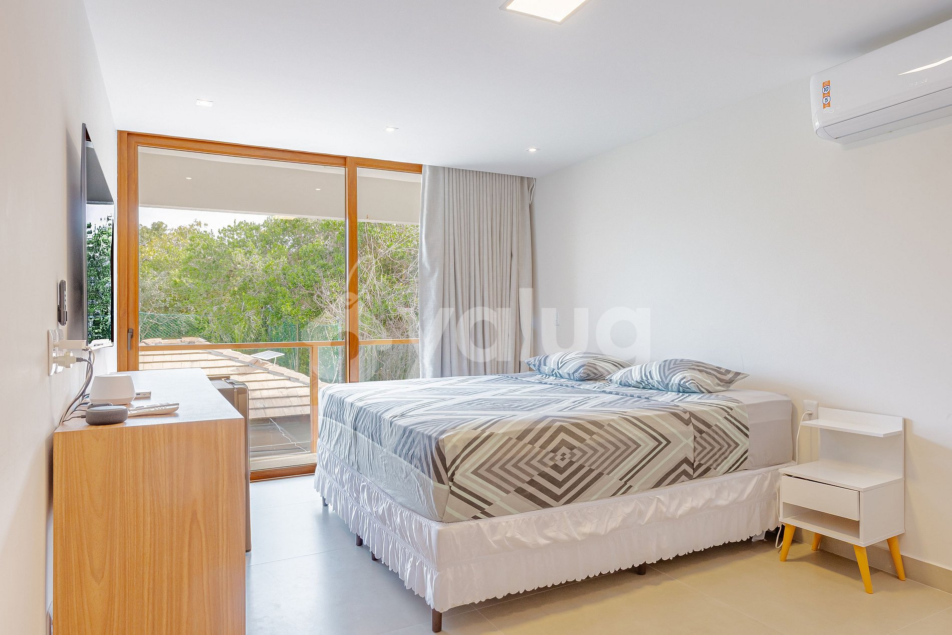 Suíte 2 (Superior): 1 cama super king, ar condicionado split, aparador, varanda e cortina blackout;