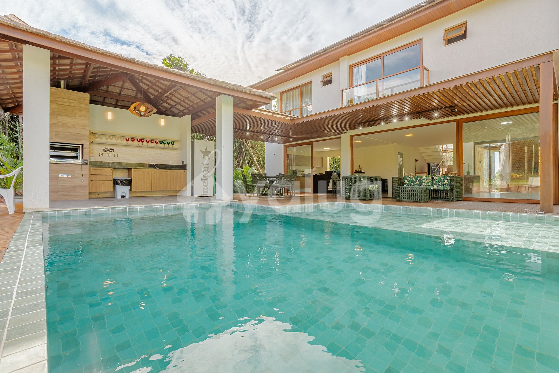 Acomodação composta por 5 suítes, mobiliadas e climatizadas. Além disso conta com sala de estar e jantar, cozinha completa e carregador para veículo elétrico. Área gourmet com churrasqueira, uma belíssima piscina, campo de vôlei, sauna, e muito mais para você usufruir durante sua estadia.