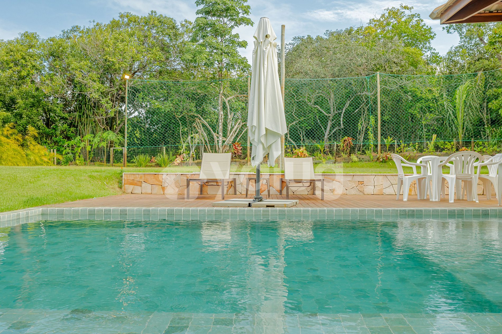 A área externa da casa é sem dúvidas a melhor parte, sendo equipada com piscina, mobílias para refeições e uma área verde de contato direto com a natureza.
