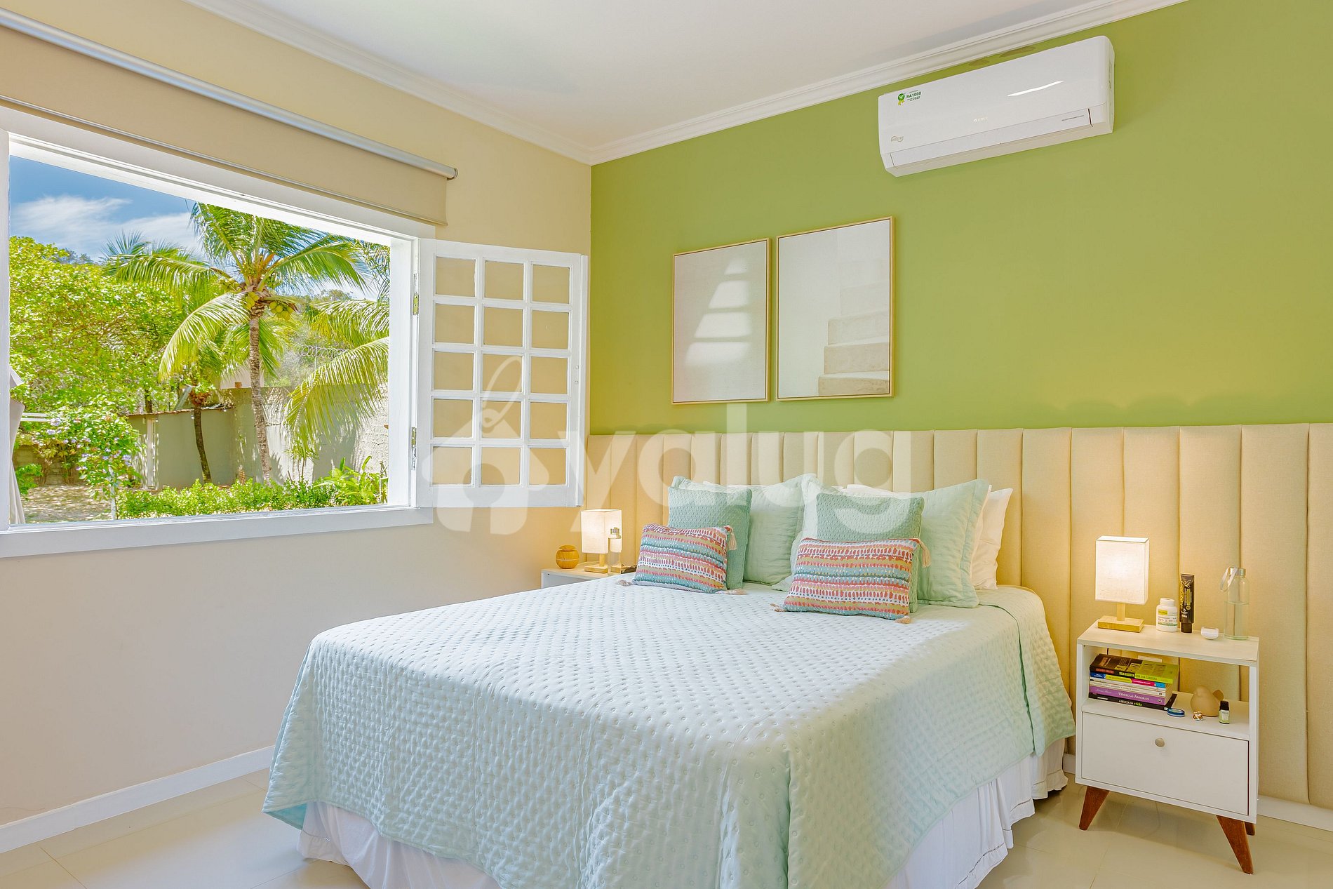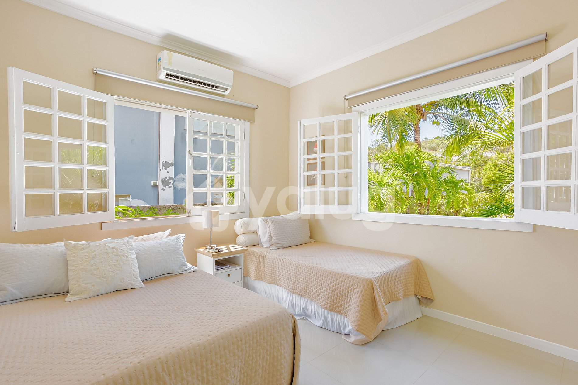 Quarto 2: 1 cama, 1 Cama solteiro, TV, ar-condicionado e guarda-roupa e 1 colchão solteiro.