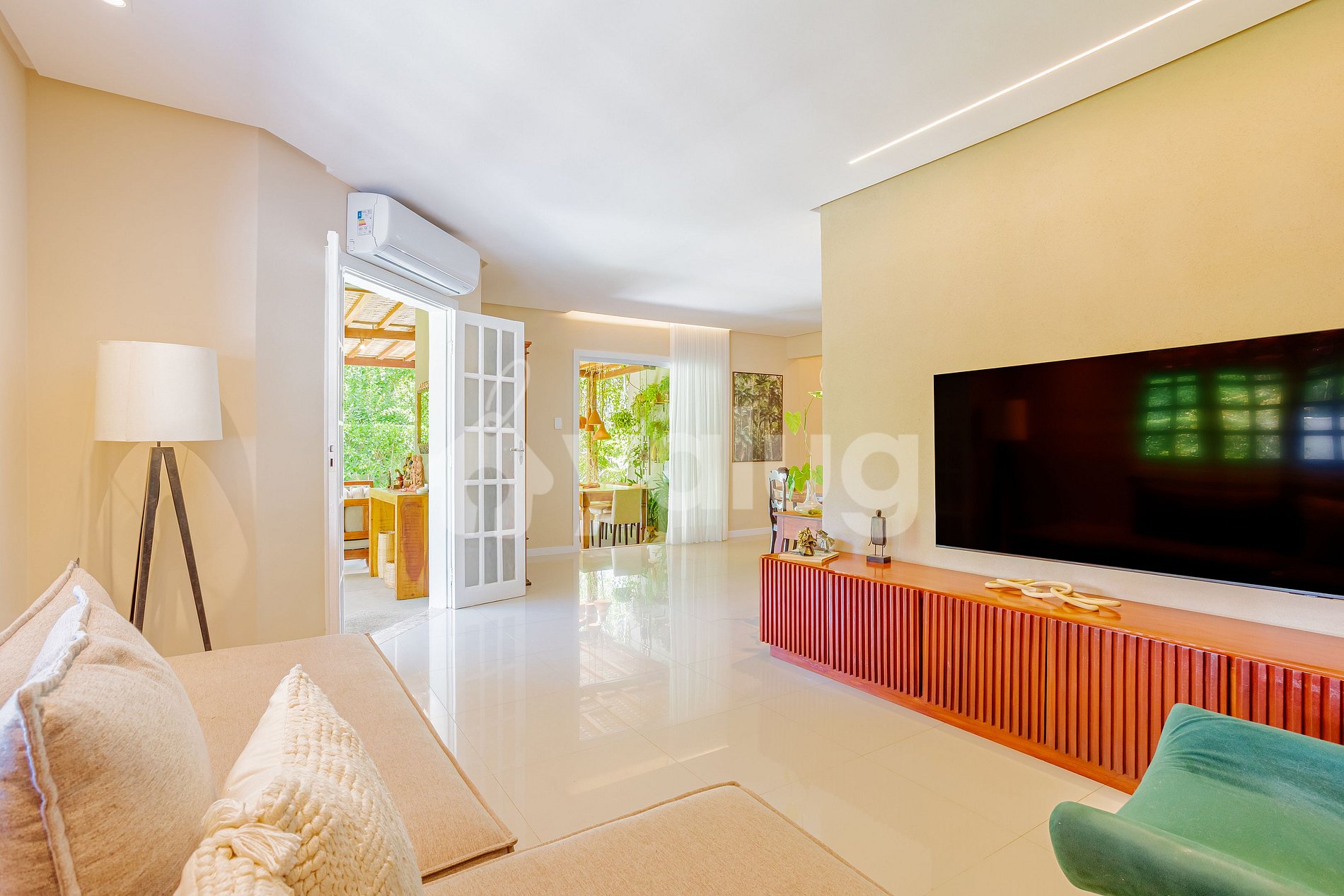 No interior do imóvel, há 3 lindos aposentos, sendo 1 suíte e 2 quartos, todos climatizados! A sala de estar é confortável e arejada; e a cozinha é completa com todos os itens essenciais para a sua estadia.