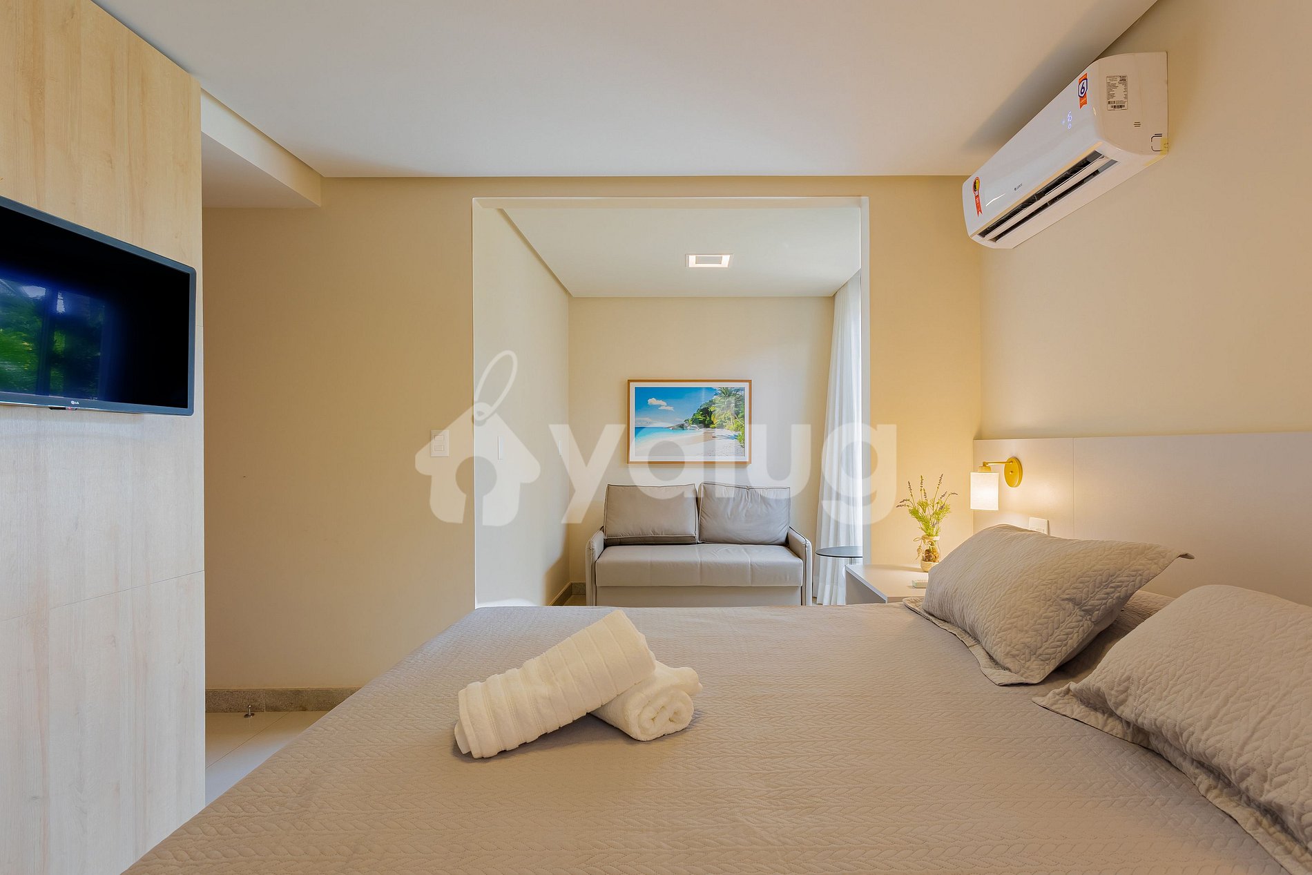 Suíte 3 (térreo): 1 cama queen, 1 sofá-cama, ar condicionado split, cortina blackout, armário e Smart tv;