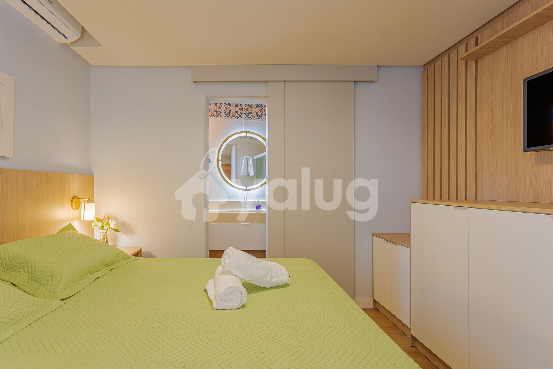 Suíte 5 (externa): 1 cama queen, ar condicionado split, cortina blackout, armário e Smart tv;