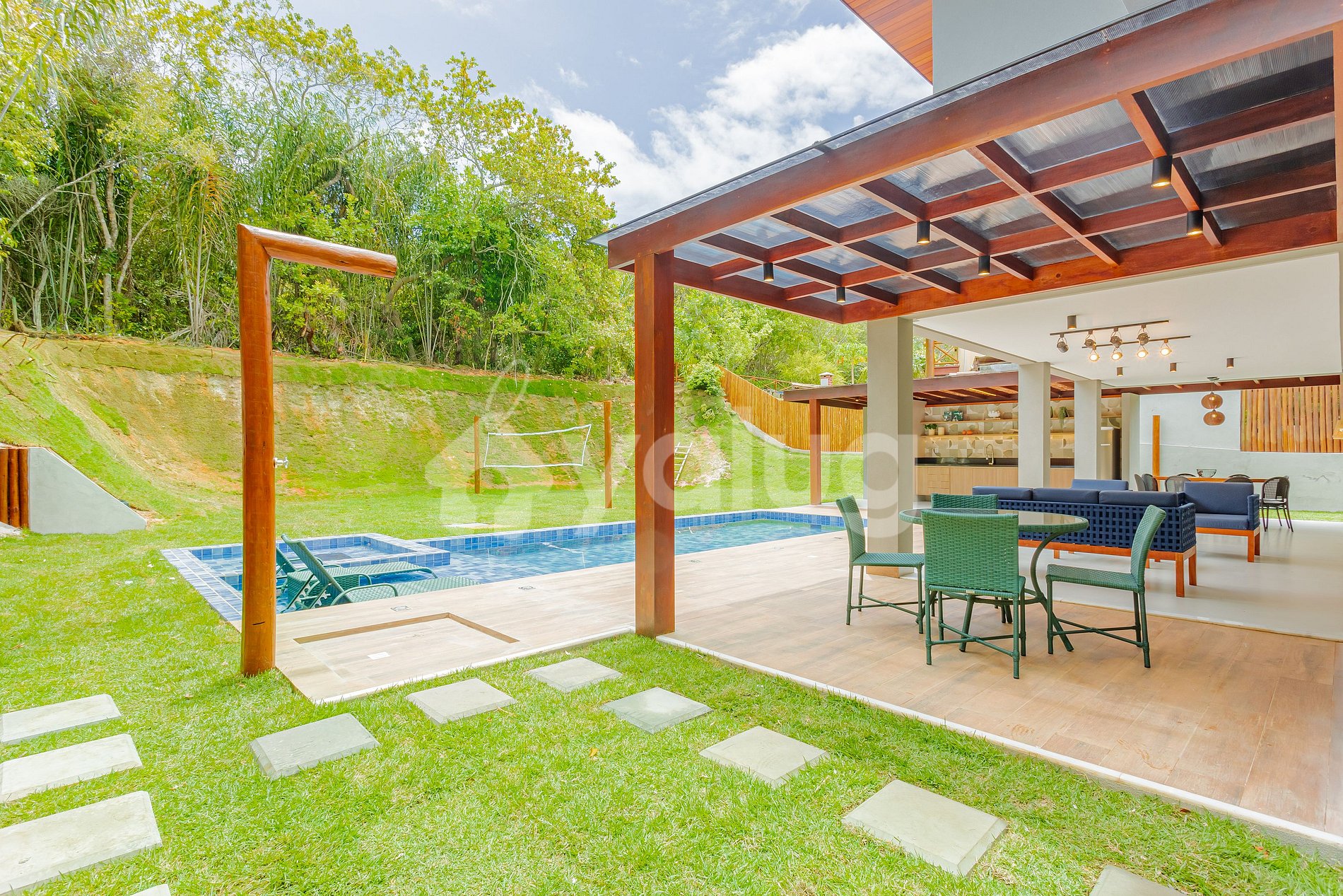 A área gourmet é incrível! Ela é equipada com extensa piscina, excelente churrasqueira, diversos móveis externos e jardim! Salas de estar e jantar são espaçosas e lindamente decoradas para a sua recepção! Além disso, o imóvel possui linda cozinha com todos o itens essenciais para a sua estadia.