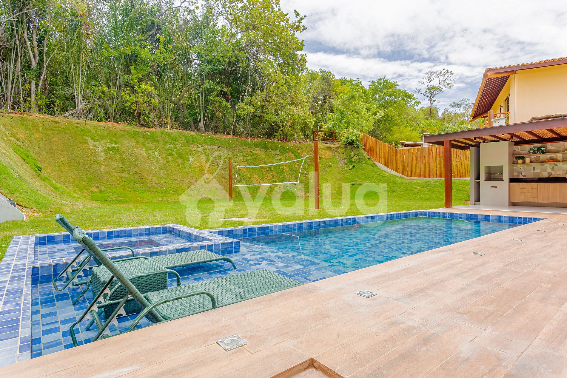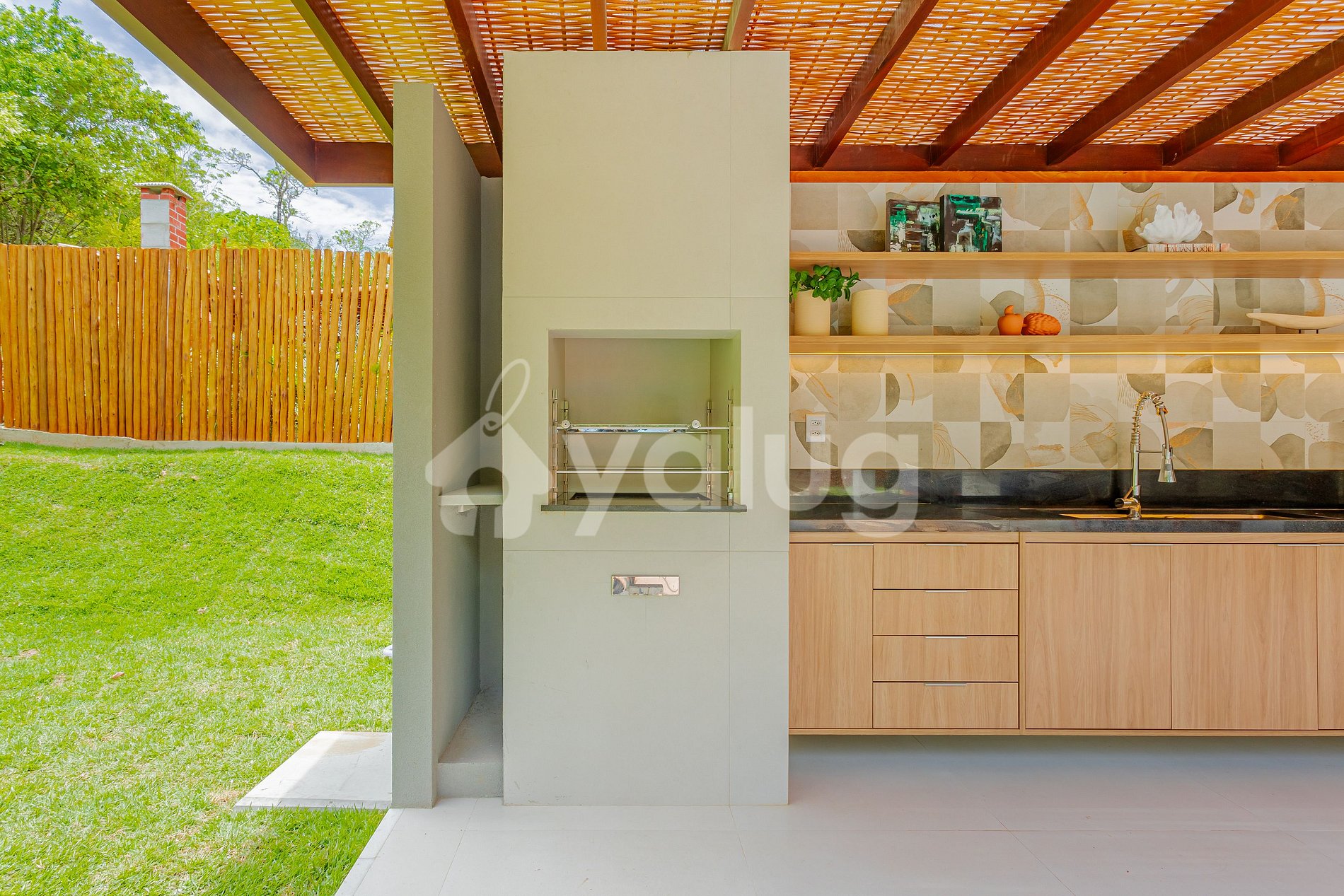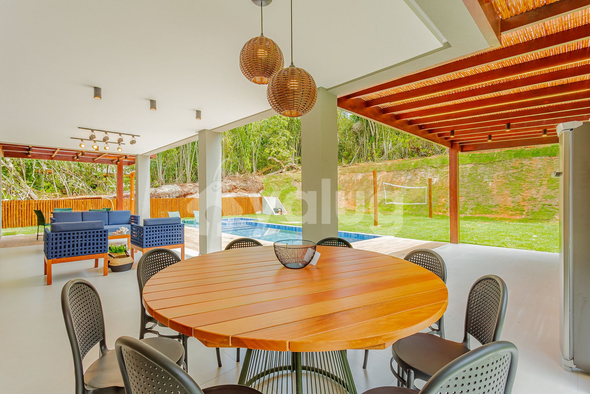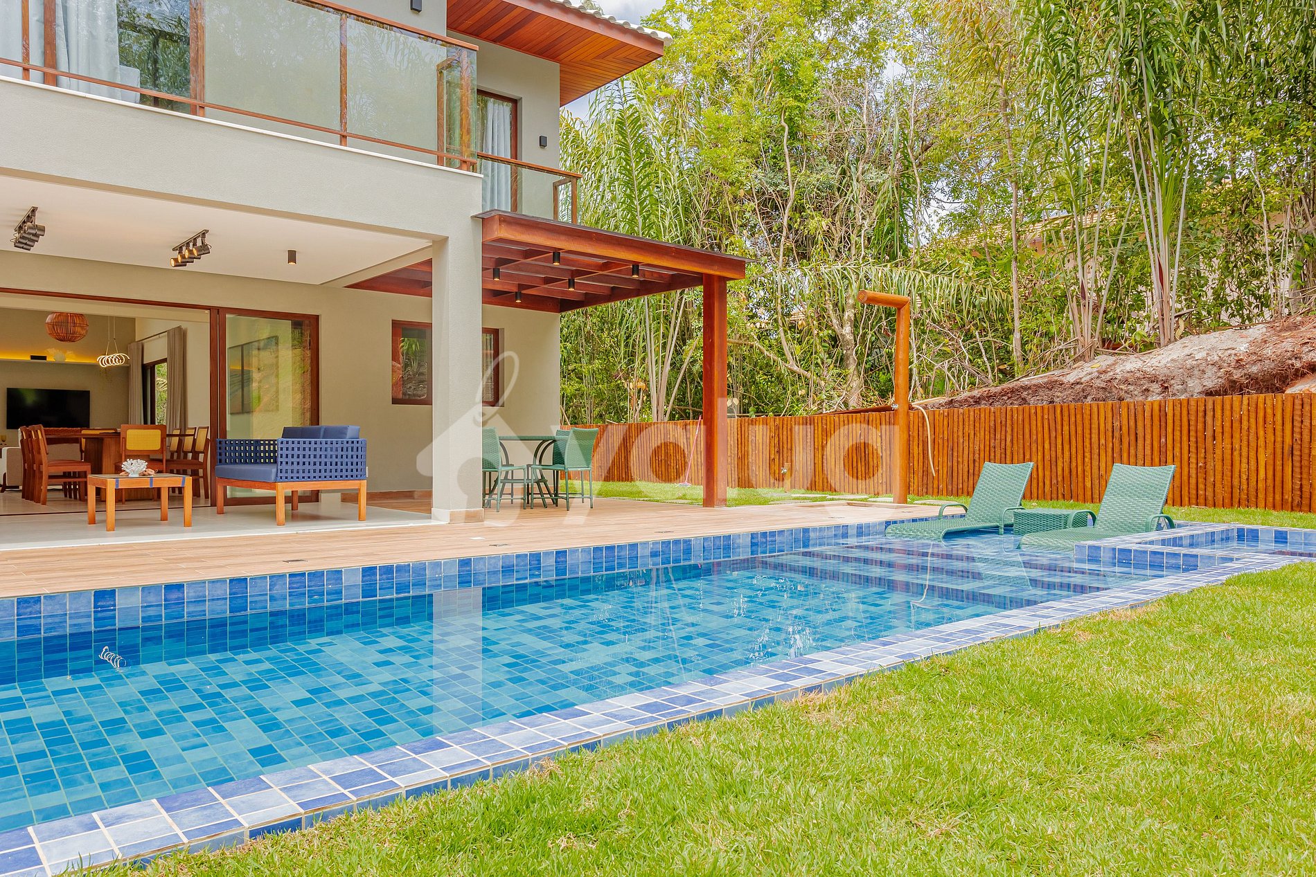 A área gourmet é incrível! Ela é equipada com extensa piscina, excelente churrasqueira, diversos móveis externos e jardim! Salas de estar e jantar são espaçosas e lindamente decoradas para a sua recepção! Além disso, o imóvel possui linda cozinha com todos o itens essenciais para a sua estadia.
