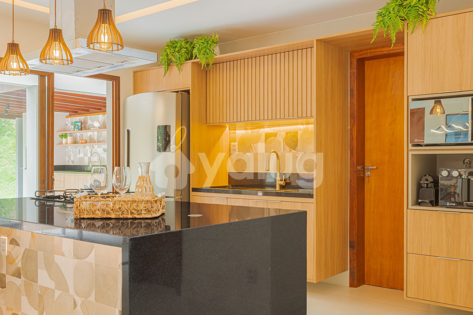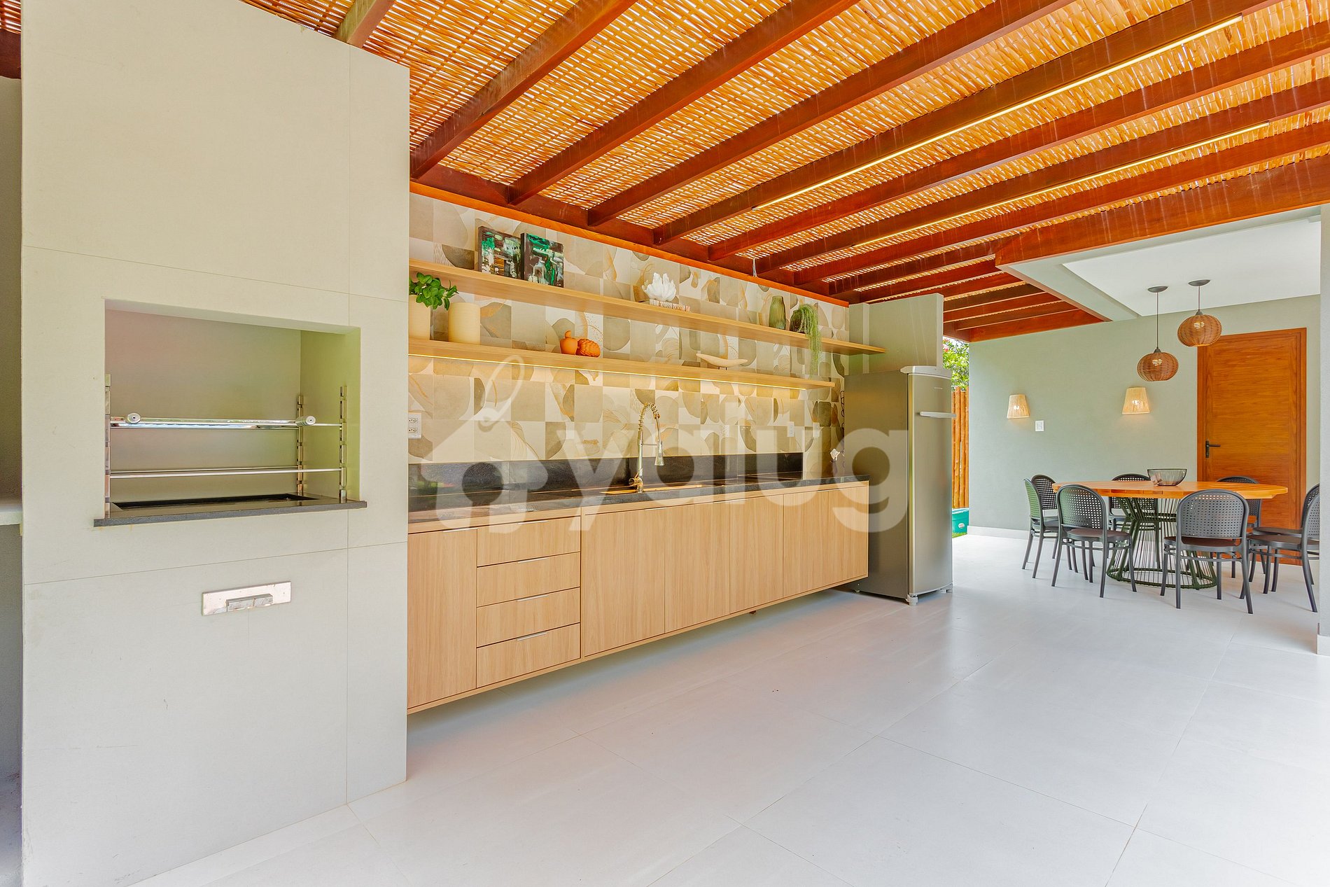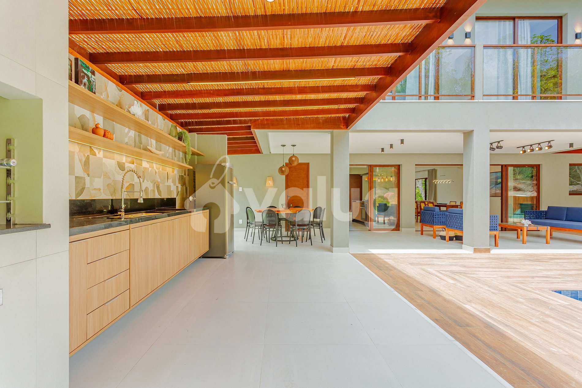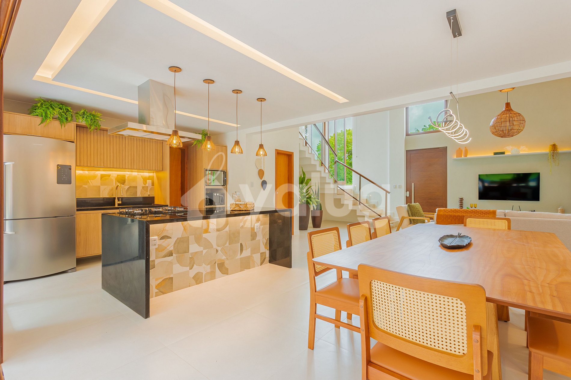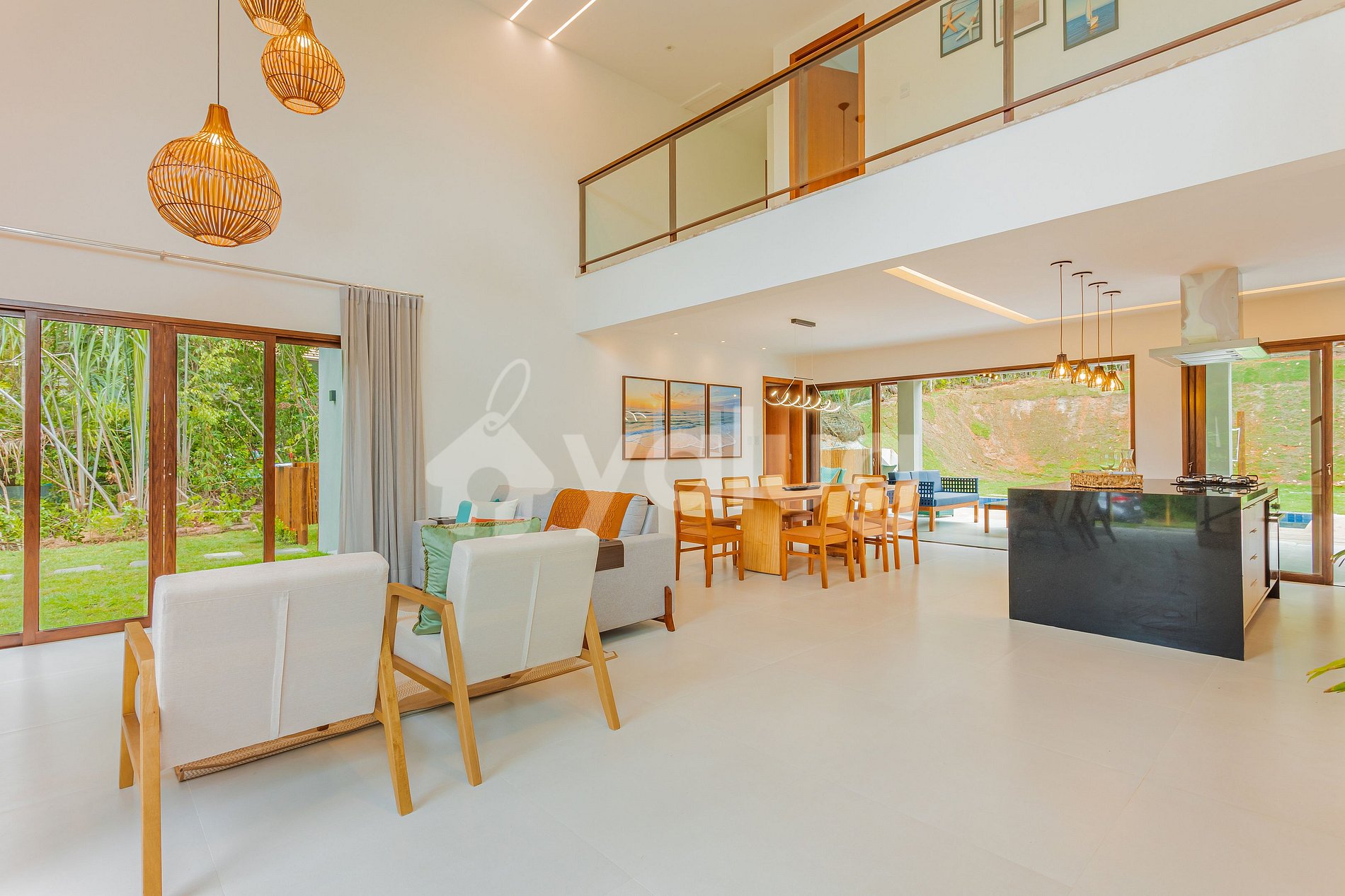 A área gourmet é incrível! Ela é equipada com extensa piscina, excelente churrasqueira, diversos móveis externos e jardim! Salas de estar e jantar são espaçosas e lindamente decoradas para a sua recepção! Além disso, o imóvel possui linda cozinha com todos o itens essenciais para a sua estadia.