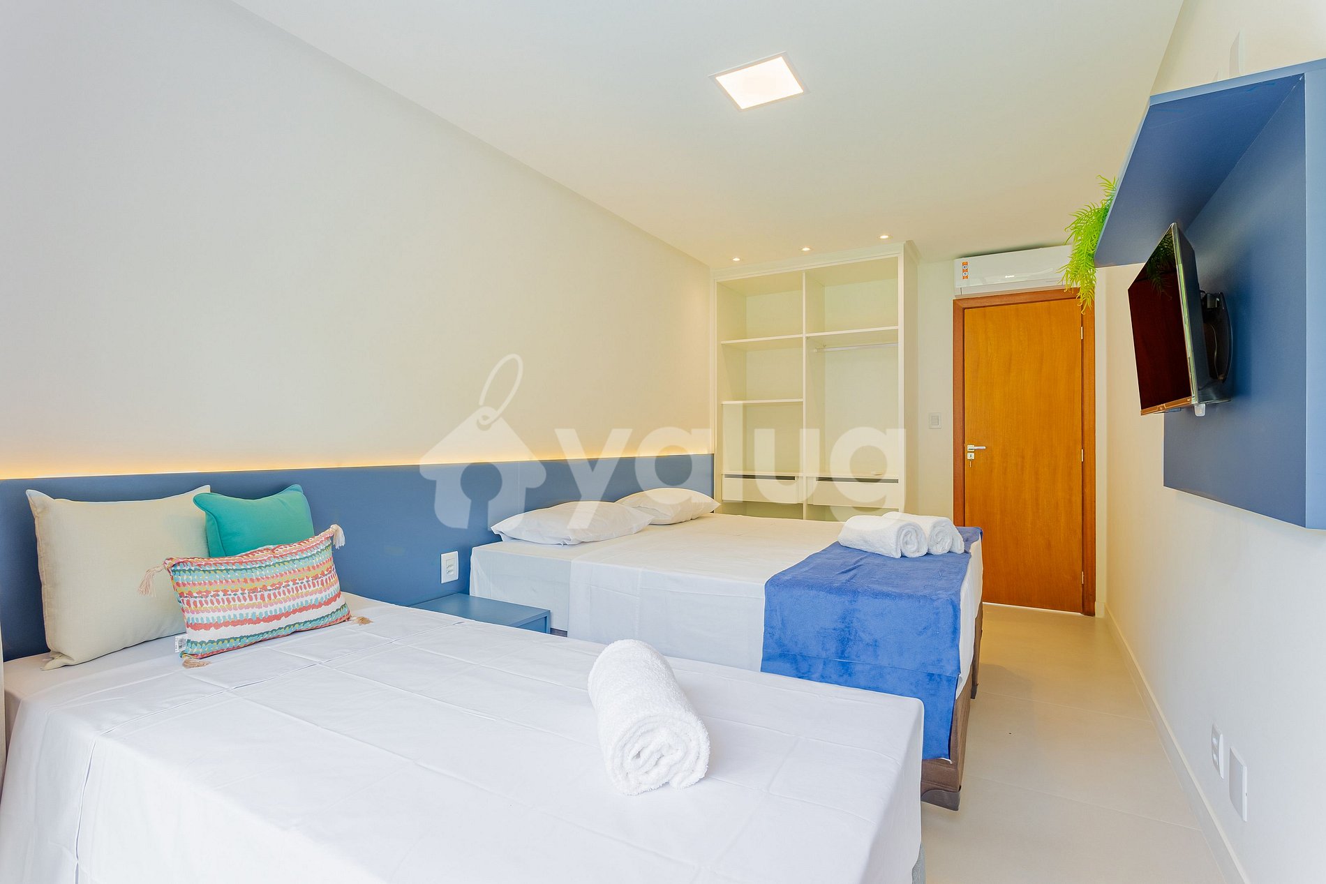Suíte 5 (Superior): 1 cama casal, 1 cama solteiro, TV, ar-condicionado, cortina, black out e guarda roupas, varanda.