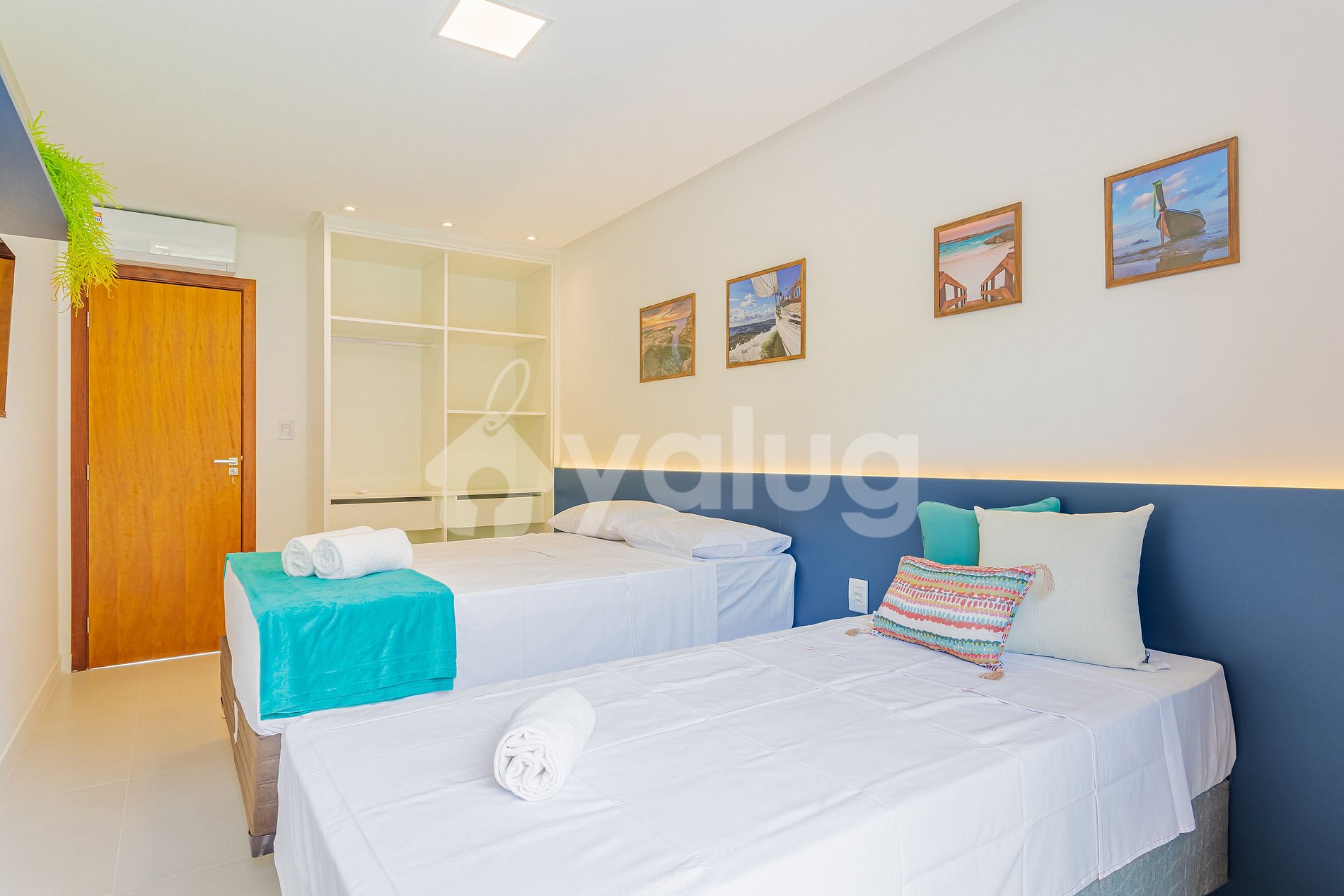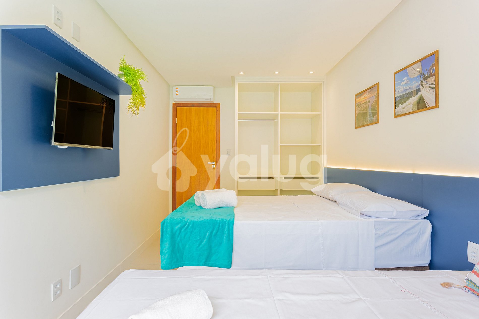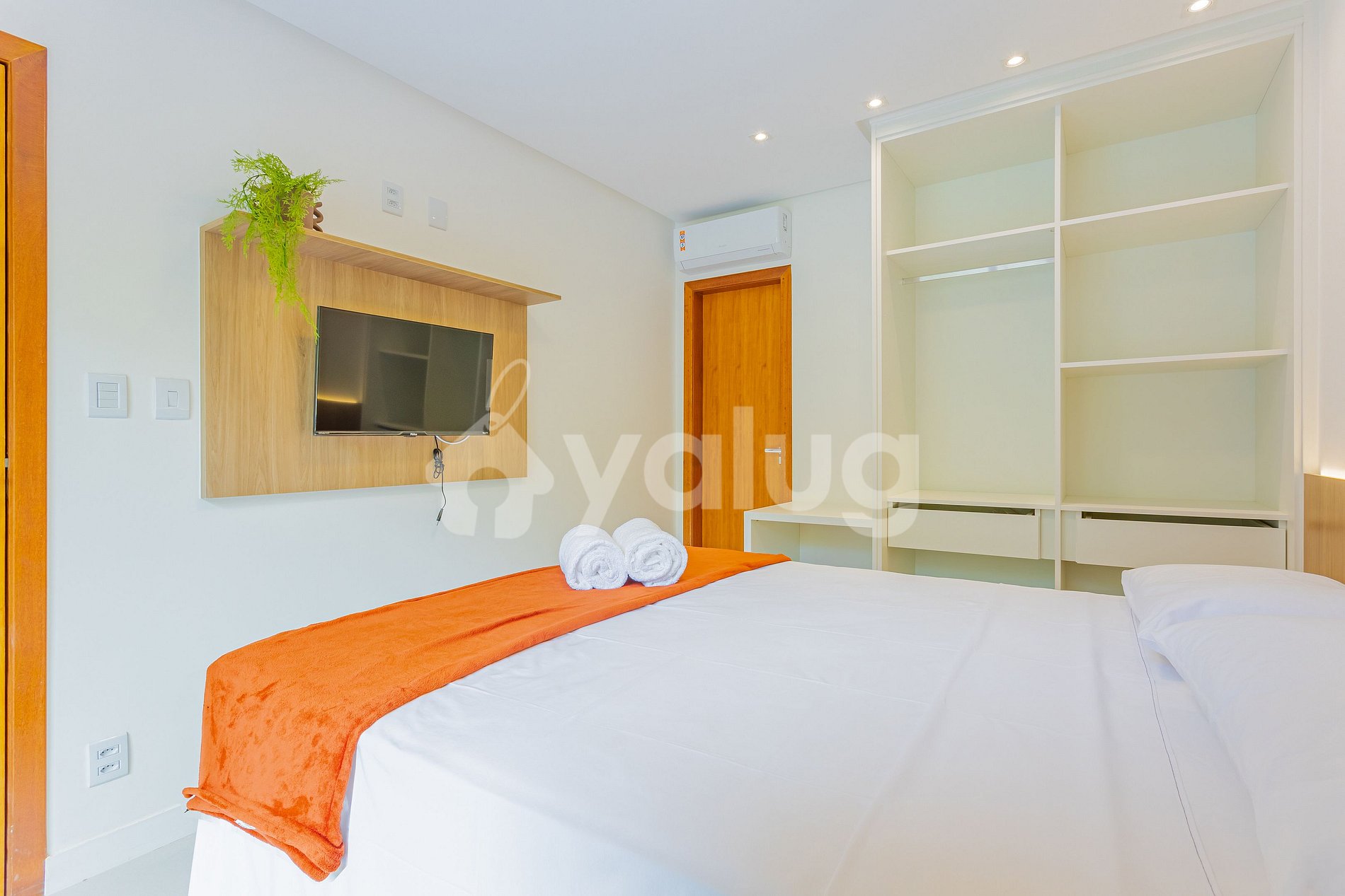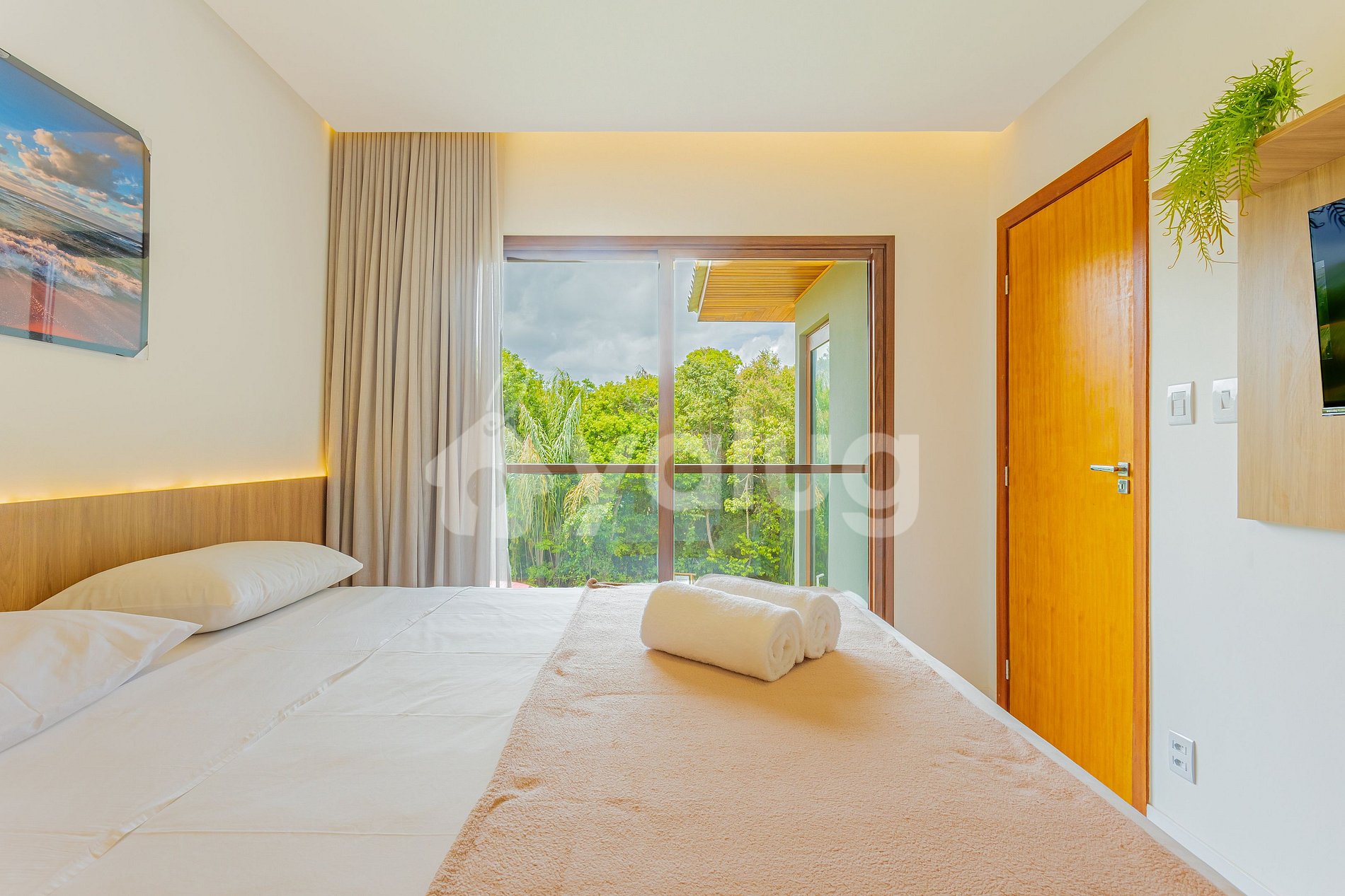 Suíte 2 (Superior): 1 cama casal, TV, ar-condicionado, cortina, black out e guarda-roupas, varanda.