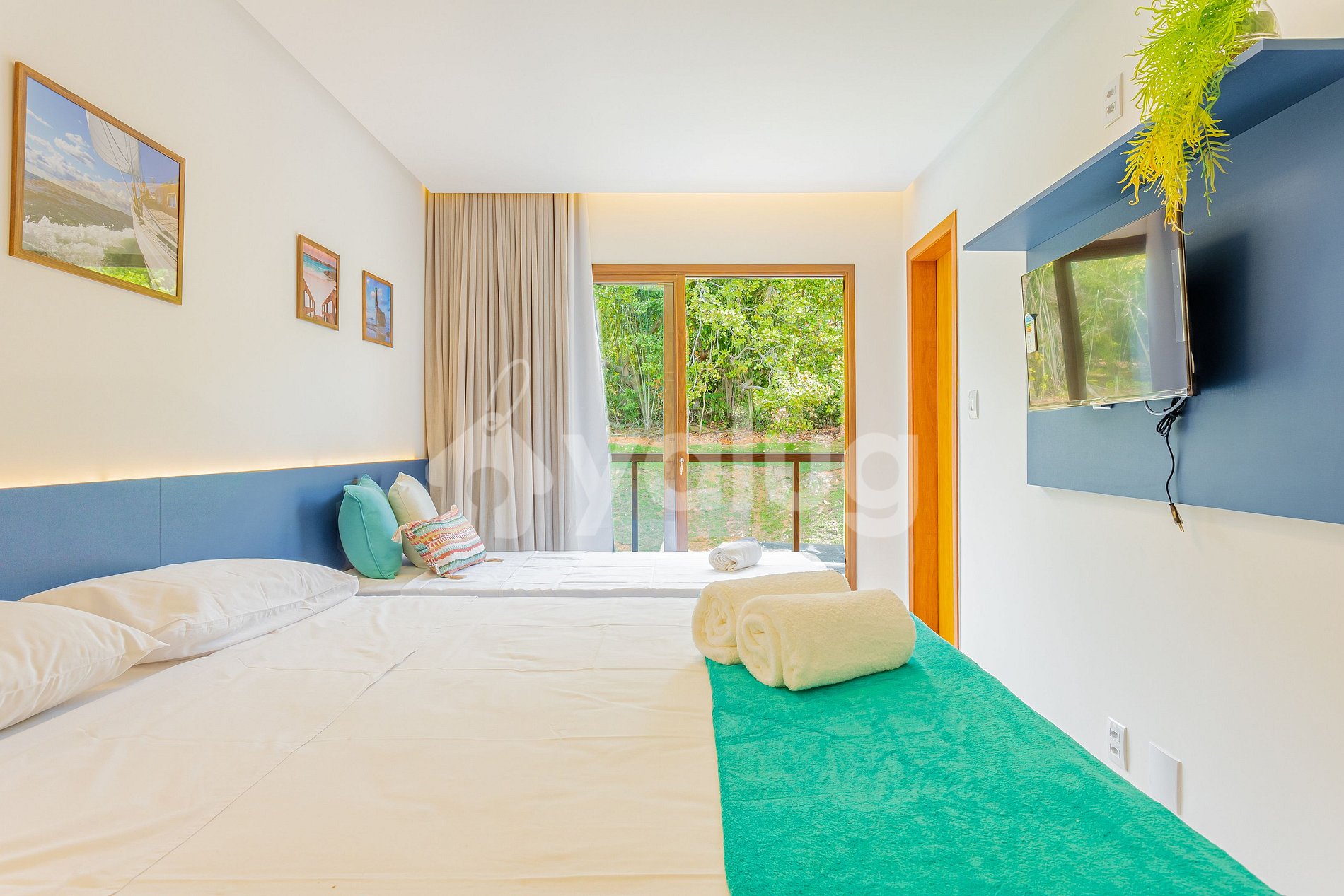 Suíte 3 (Superior): 1 cama casal, TV, ar-condicionado, cortina, black out e guarda-roupas, varanda.