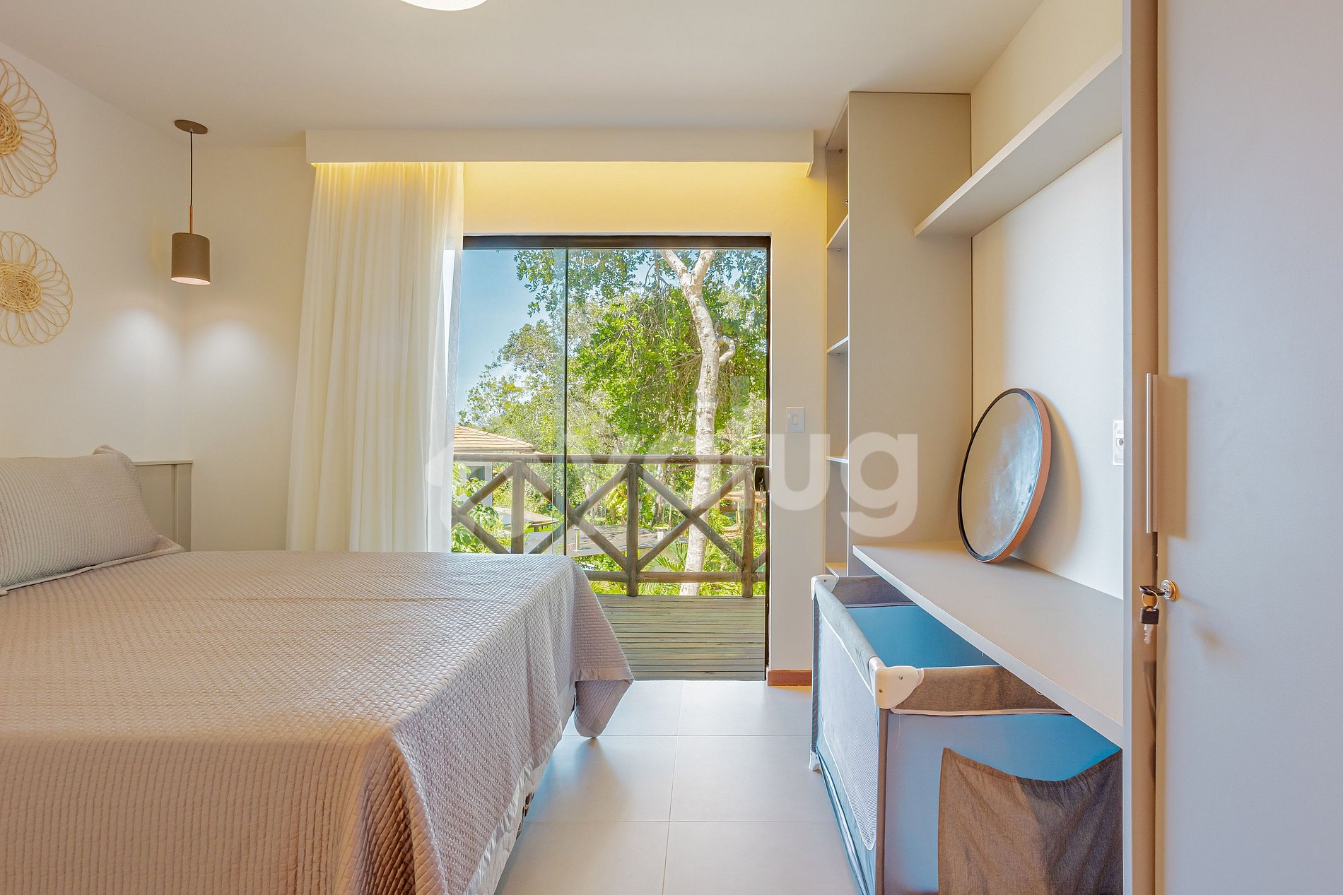 Quarto (Térreo): 1 cama queen, ar-condicionado, cortina e black out.