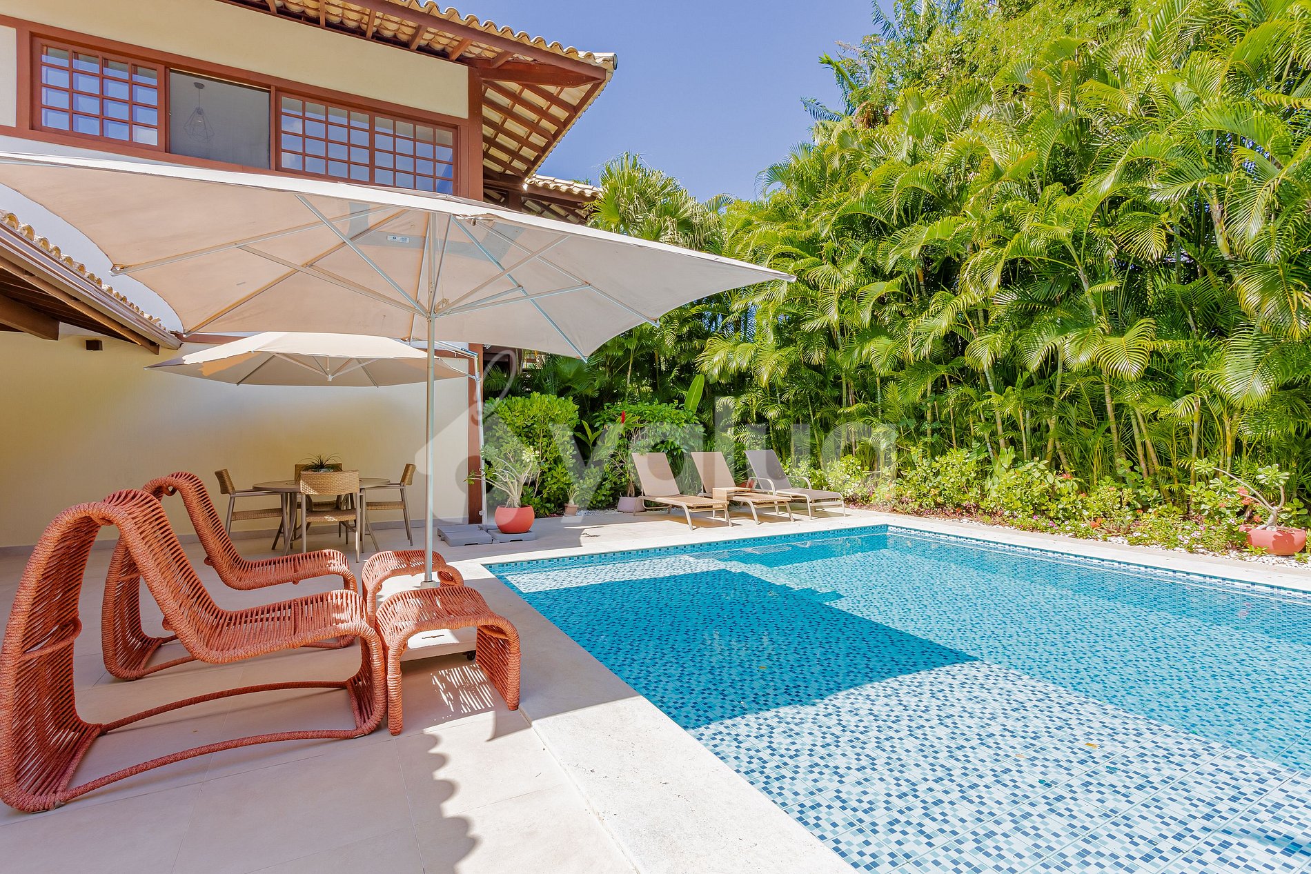 Dispõe de 3 quartos (2 suites), cozinha completa, sala de estar aconchegante e com acesso direto à melhor parte da casa: a área externa! Com maravilhoso ambiente para aproveitar e relaxar, dispõe de churrasqueira, jardim e piscina!!