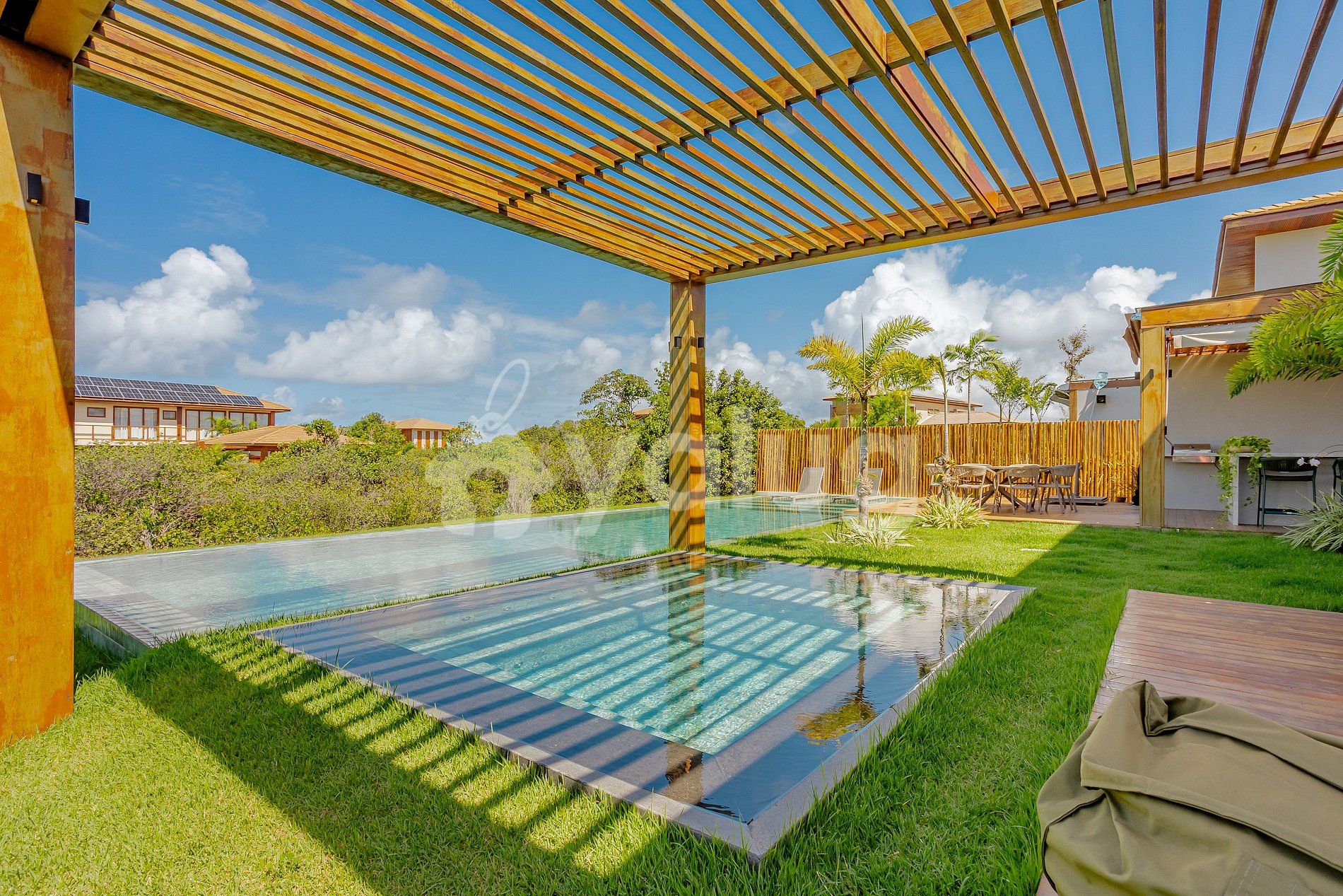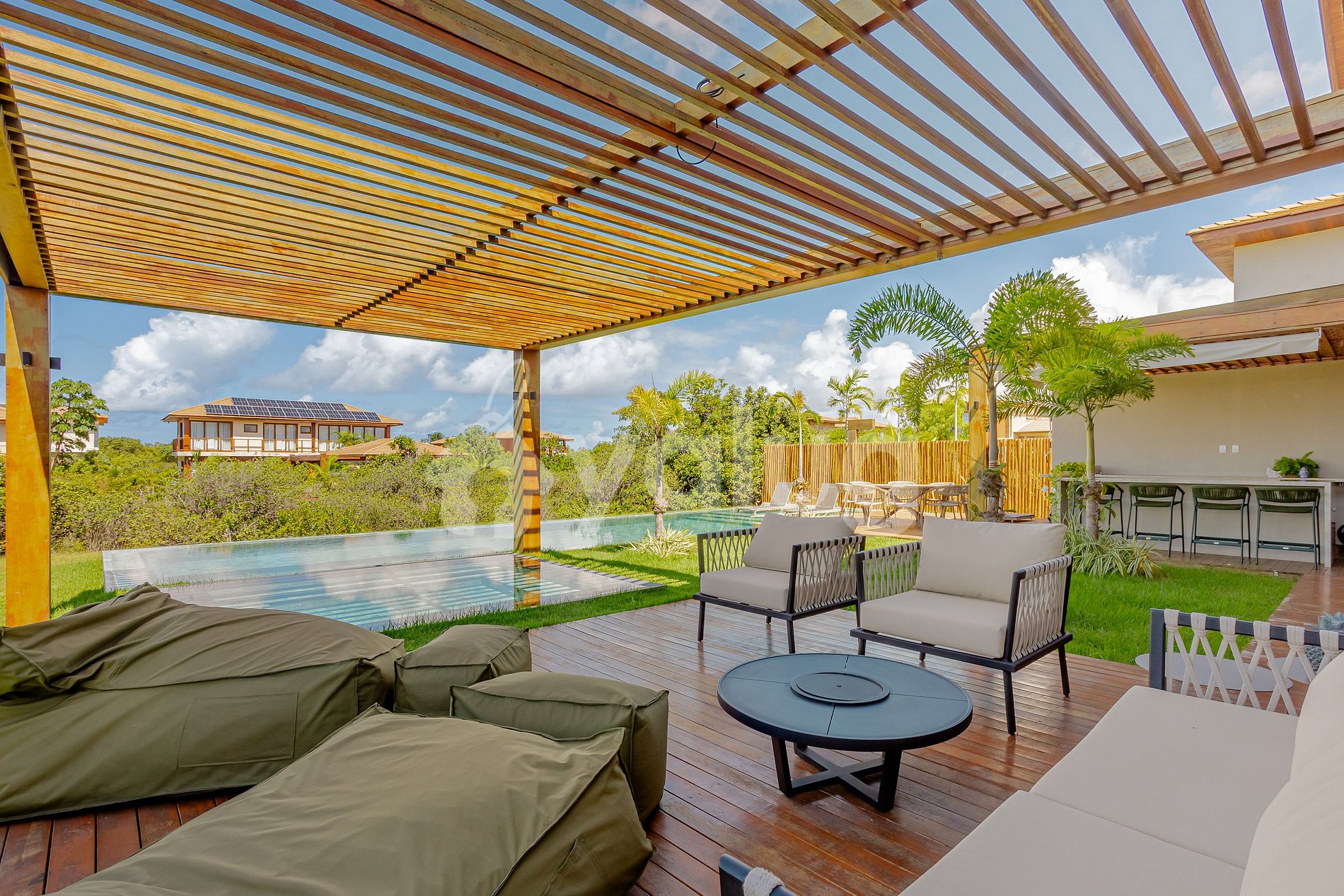 A área gourmet é simplesmente incrível, equipada com ampla piscina, churrasqueira, móveis externos e um belo jardim. As salas de estar e jantar são espaçosas e decoradas com muito bom gosto, perfeitas para momentos de lazer e conforto.