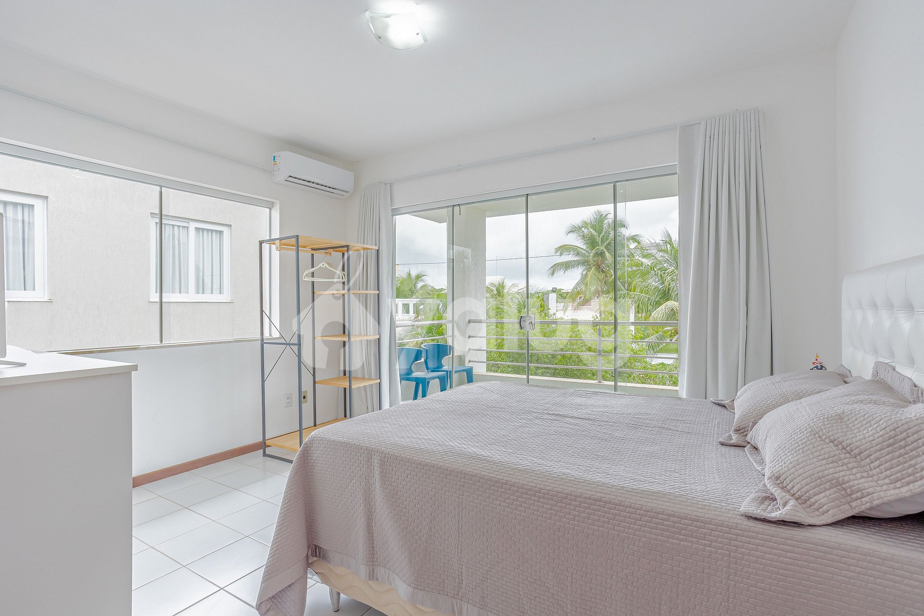 Suíte 1 (Superior): 1 cama casal, TV, varanda, ar-condicionado, cortina, black out e cômoda.