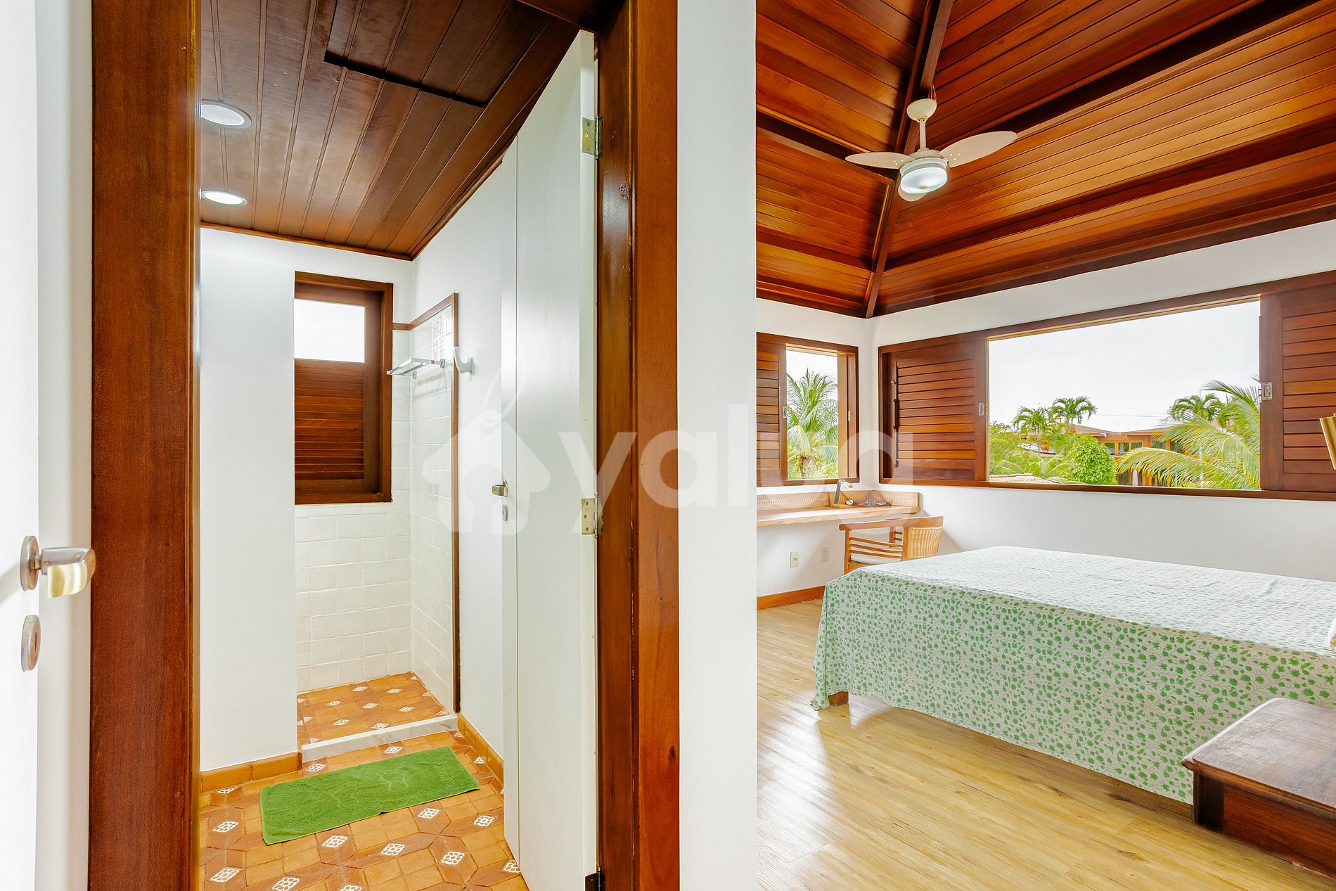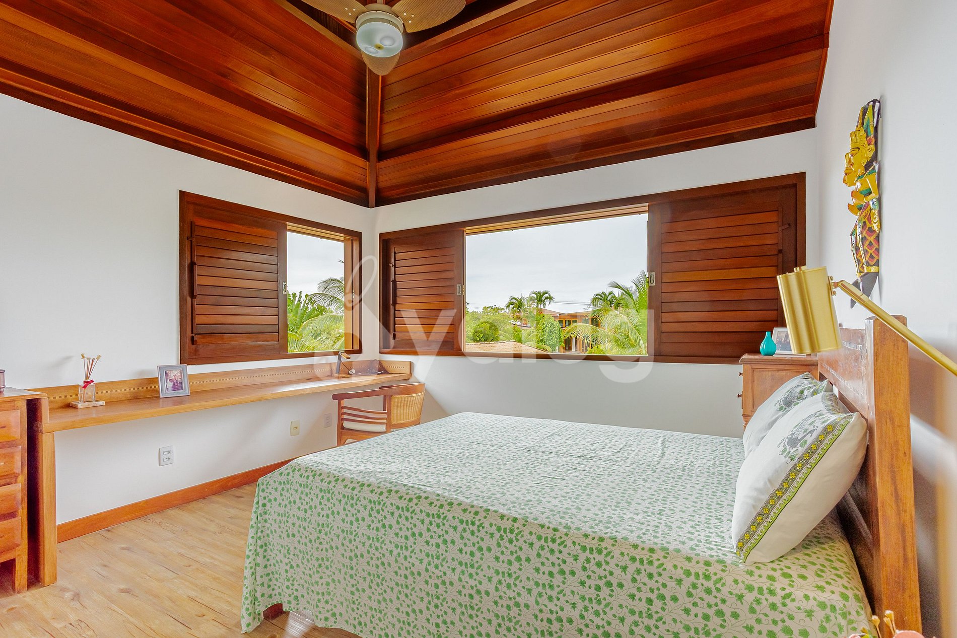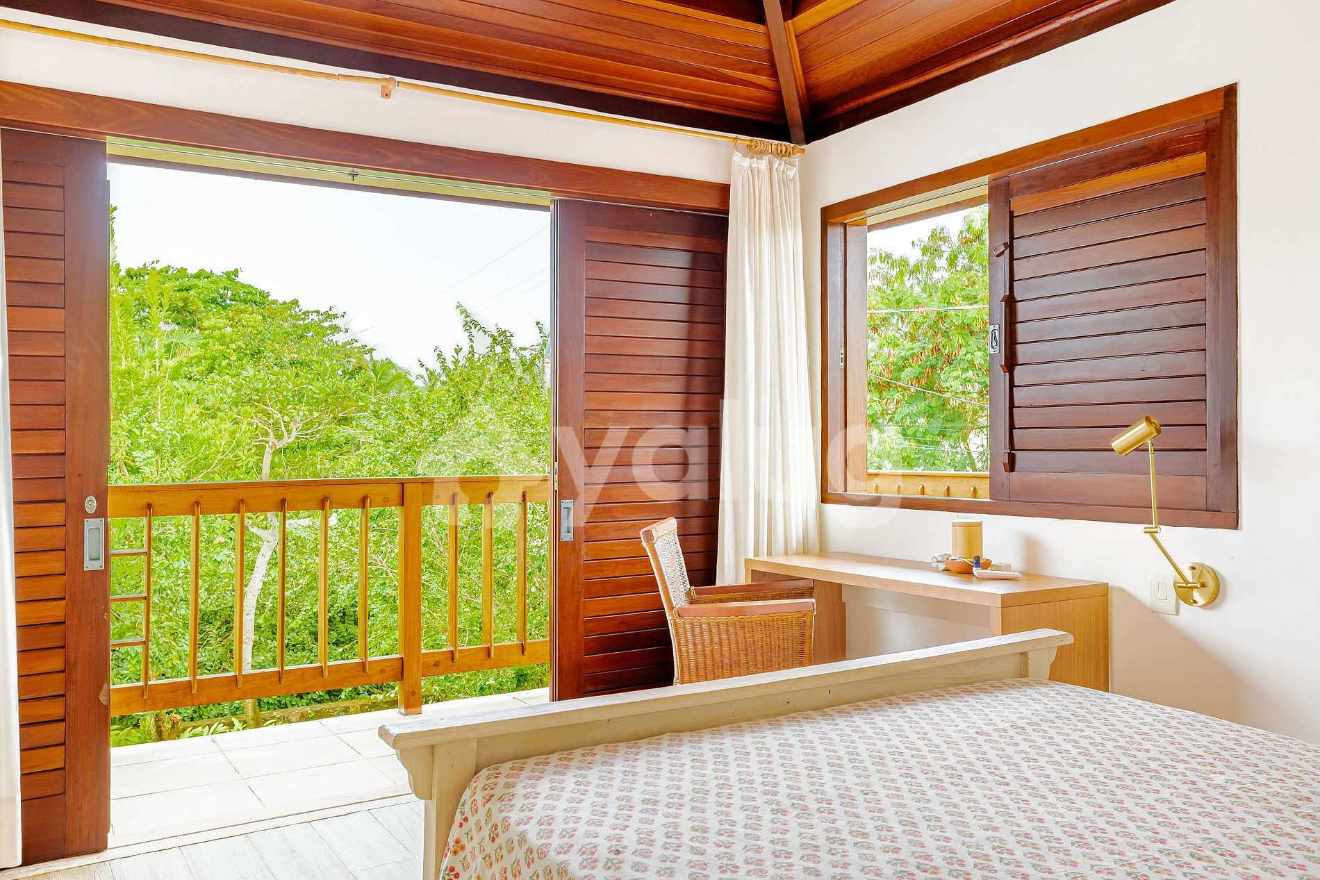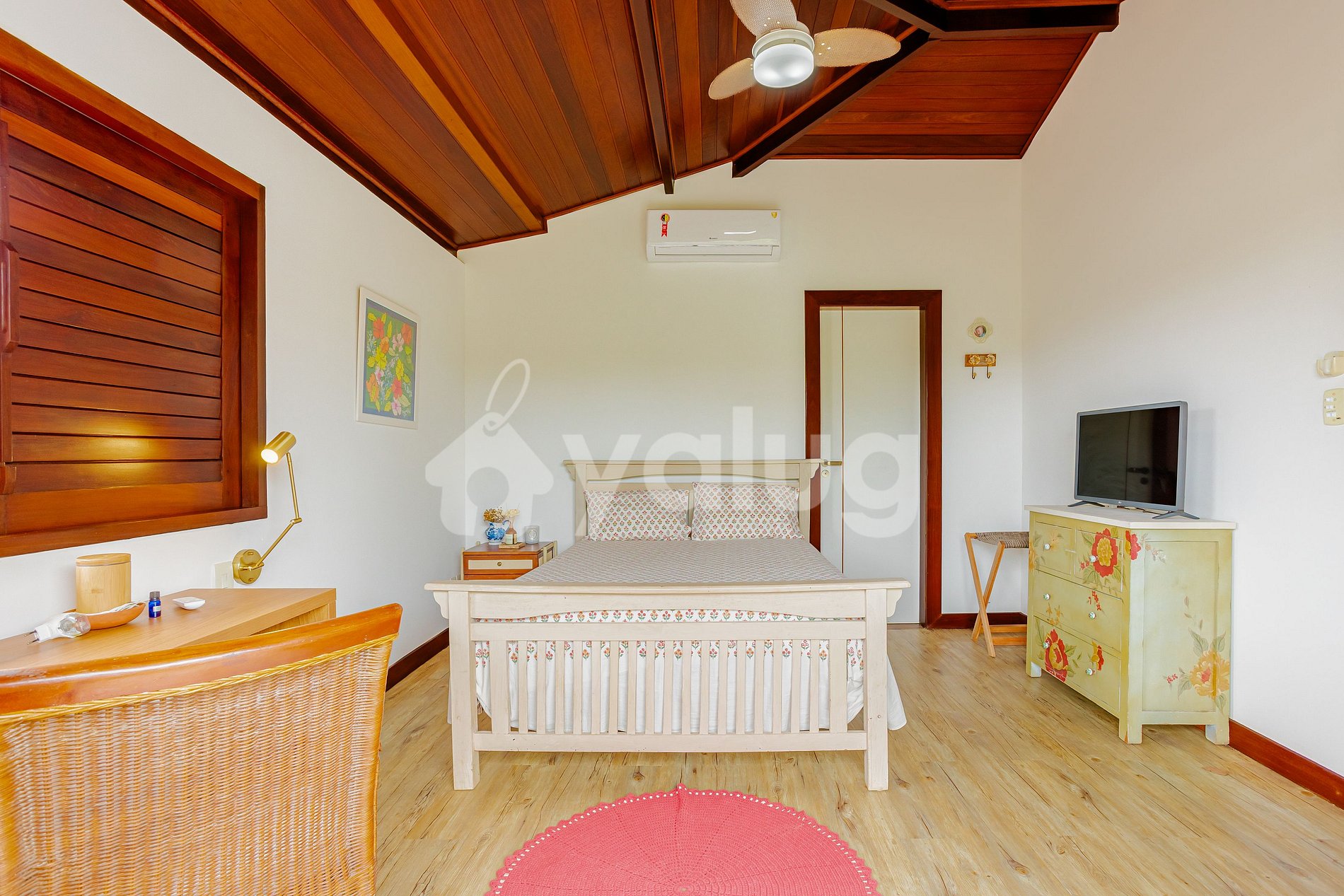 Suíte 1(Superior): 1 cama casal, TV, varanda, ar-condicionado e cômoda.