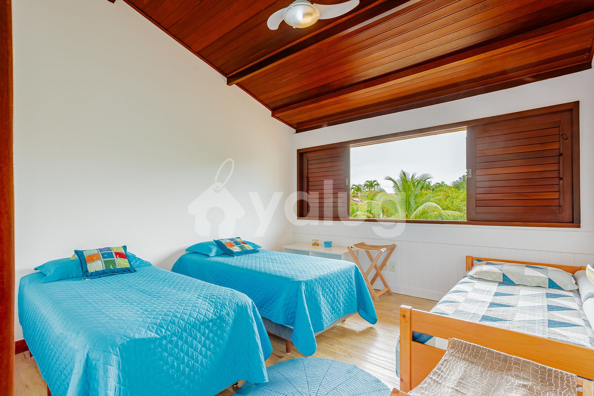 Quarto 2 (Superior): 3 camas solteiro, 1 cama auxiliar, ar-condicionado e cômoda.