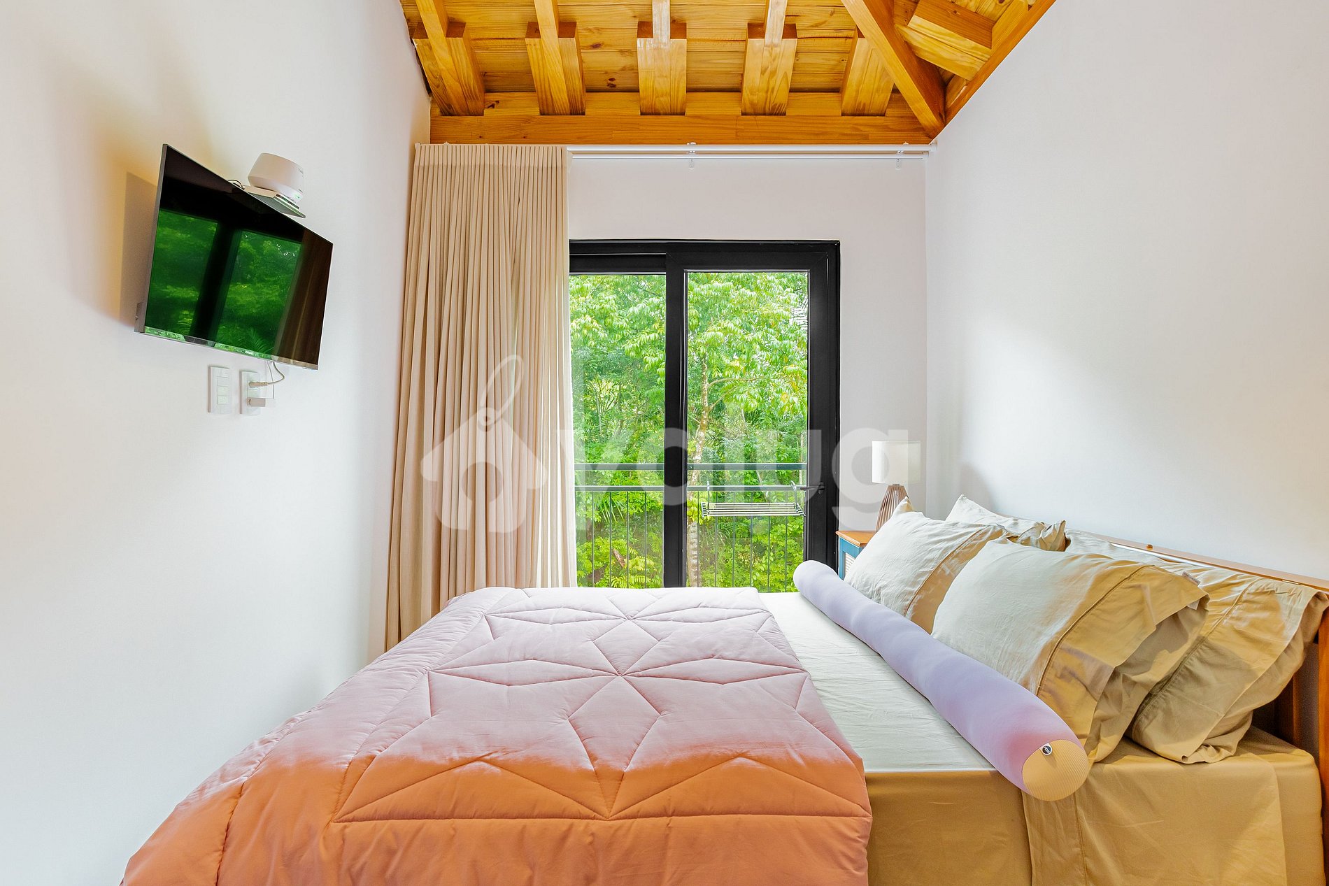 Suíte 2: 1 cama casal, TV, ar-condicionado, guarda-roupas e persiana.