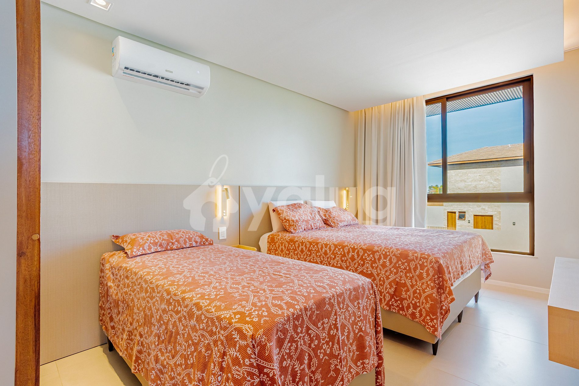 Suíte 6 (Superior): 2 camas solteiro, ar-condicionado, cortina, blackout e armários.