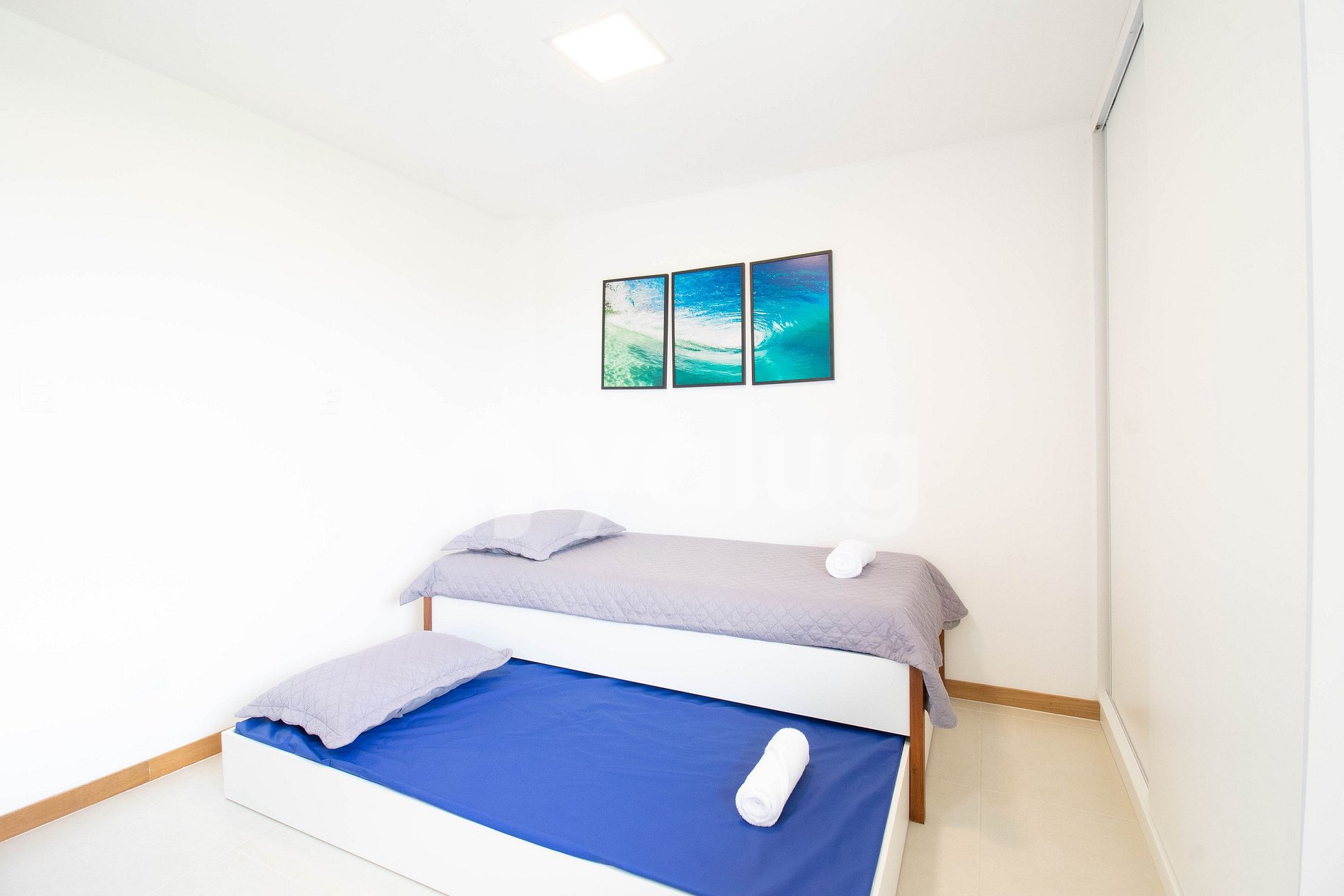 Suíte 4: 2 camas de solteiro, 1 colchão de solteiro, ar condicionado tipo split, cortina blackout e armários.